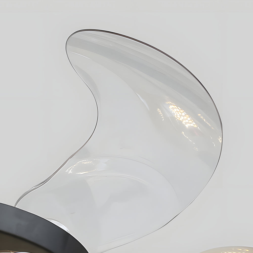 - This striking fixture boasts a unique blend of modern and post-modern aesthetics, featuring 6/8 clear glass shades in rich brown or blue hues. With 4 retractable fan blades, this ceiling fan offers versatile cooling options while maintaining a sleek and unobtrusive appearance when not in use.