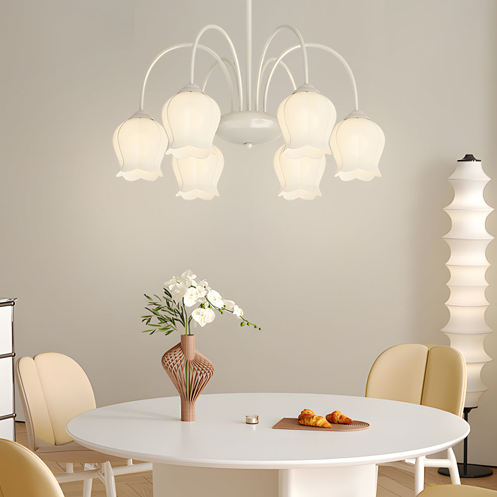 - This flower chandelier is simple and elegant. Its glass lampshade transmits bright and even light and is exquisitely crafted, adding a classic and timeless feel to the space. This lamp can be used both as lighting and decoration.
