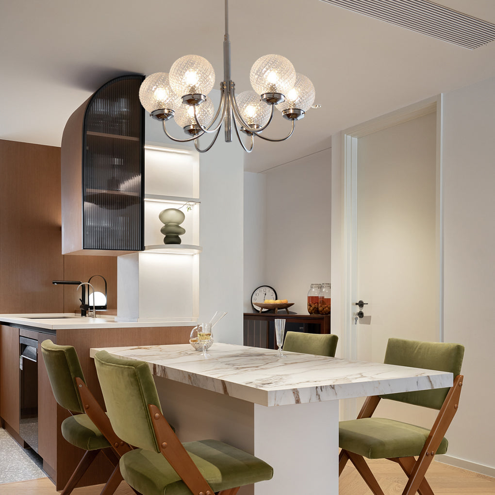 - And the electroplated hardware body makes this chandelier rustproof, sturdy and has a delicate texture. Its glass lampshade has some three-dimensional dots design, giving the lamp a different aesthetic.