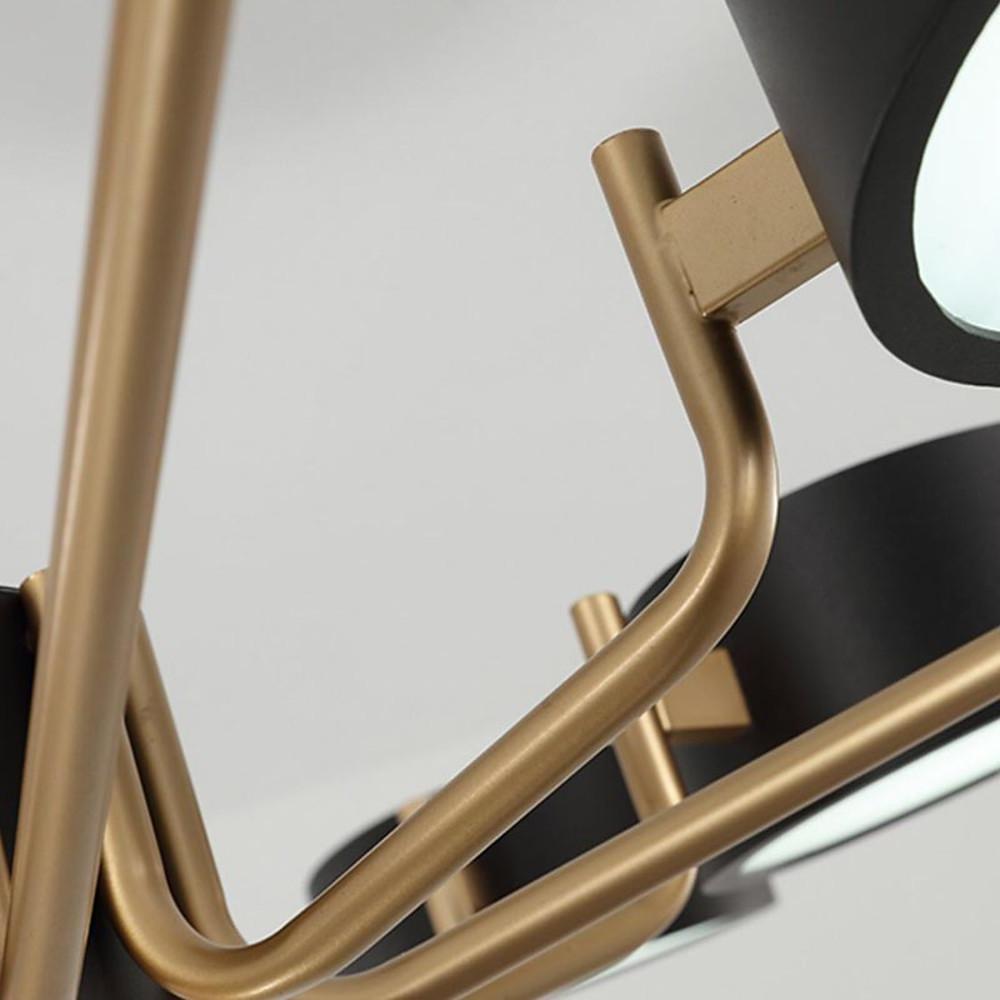 - At the core of this 8-Light modern Chandelier, there's a smooth, round hub from which several arms extend, each finished in a striking golden hue. These arms stretch out like the spokes of a wheel, ending in circular lampshades that are evenly spaced around the hub. The shades are smooth and bowl-shaped, crafted from a material that feels dense and matte to the touch. This arrangement creates a symmetrical and balanced feel, with the golden arms providing a warm contrast against the cooler texture of the shades.