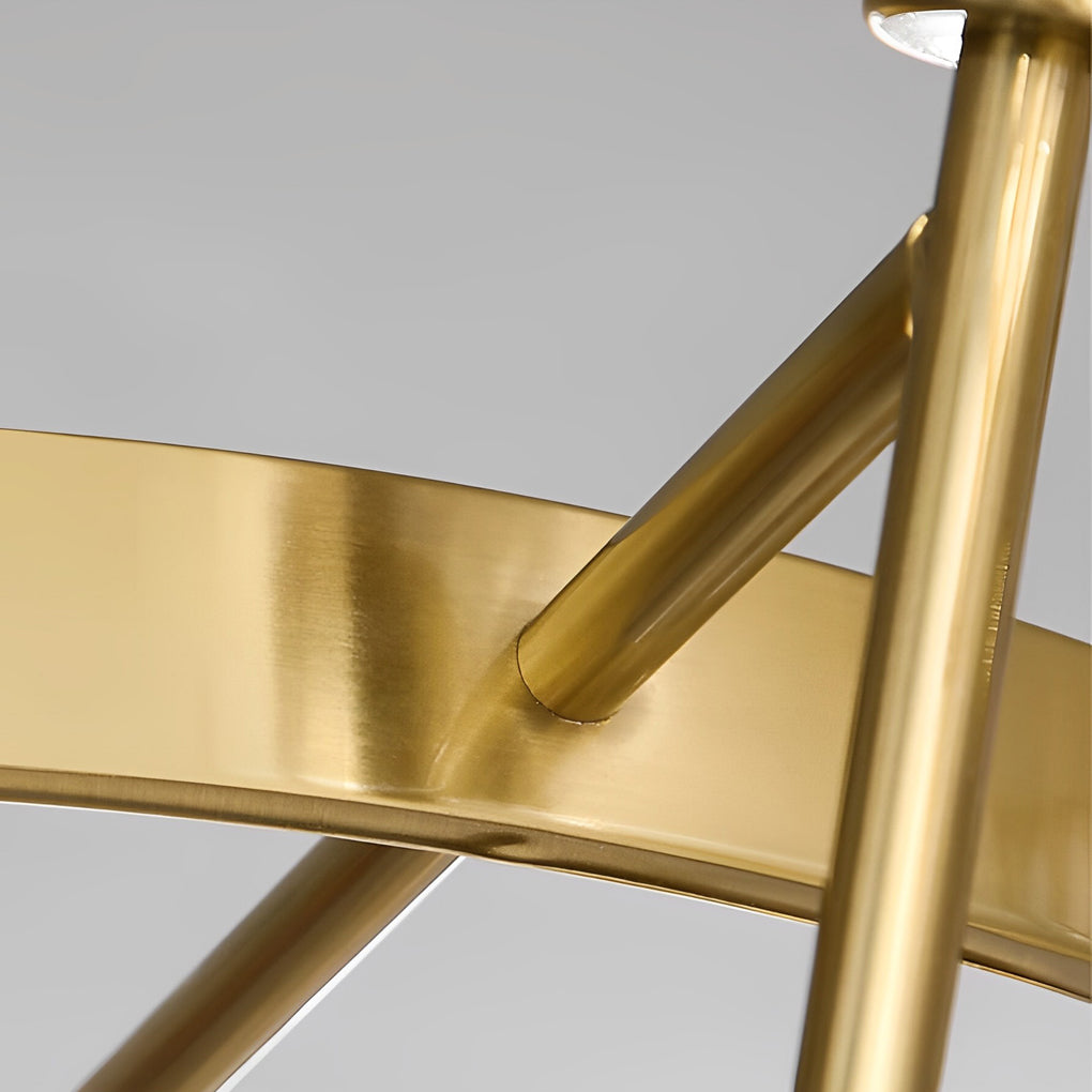 - Brass Ring Frame Crystal Chandelier, a true masterpiece designed to dazzle. The lampshades feature metal arcs that serve as branches connecting the luscious crystals to the ring metal frame. Imagine touching the smooth, electroplated gold finish of the metal, its rich texture reminiscent of luxurious silk. The chandelier features cascading crystal shades, each playing with light like fine-cut diamonds. The overall design is circular, symbolizing unity and perfection, with a consistent and symmetrical arrangement that adds to its harmonious appeal.