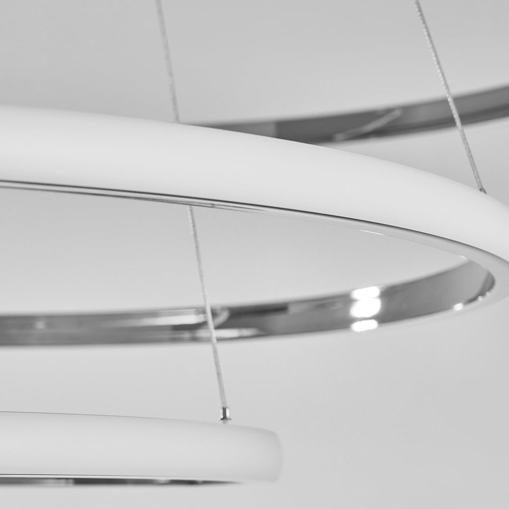 - Elevate your space with our Contemporary Nordic Hanging Ring Chandelier. Crafted with a sleek modern design featuring 3/4 rings and an adjustable cord, this chandelier is designed to captivate, it boasts a luminous silicon shade complemented by a chrome finish, adding a touch of sophistication to any room.
