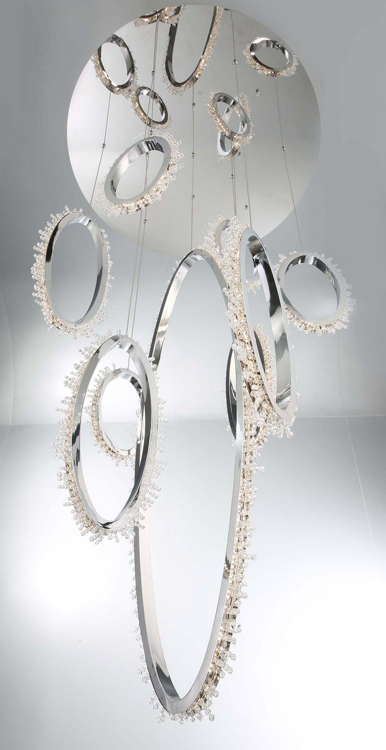 Elegant polished chrome rings are lined with artisan, handcrafted strings of crystals. The stunning form, reminiscent of icicle halos, provides a delicate beauty that's unmatched.