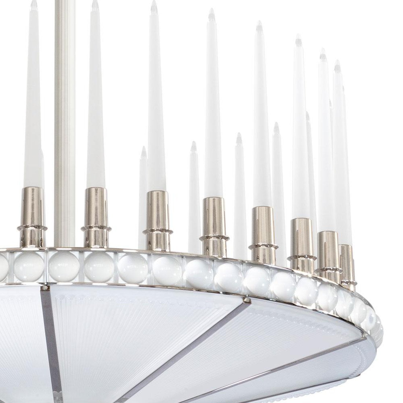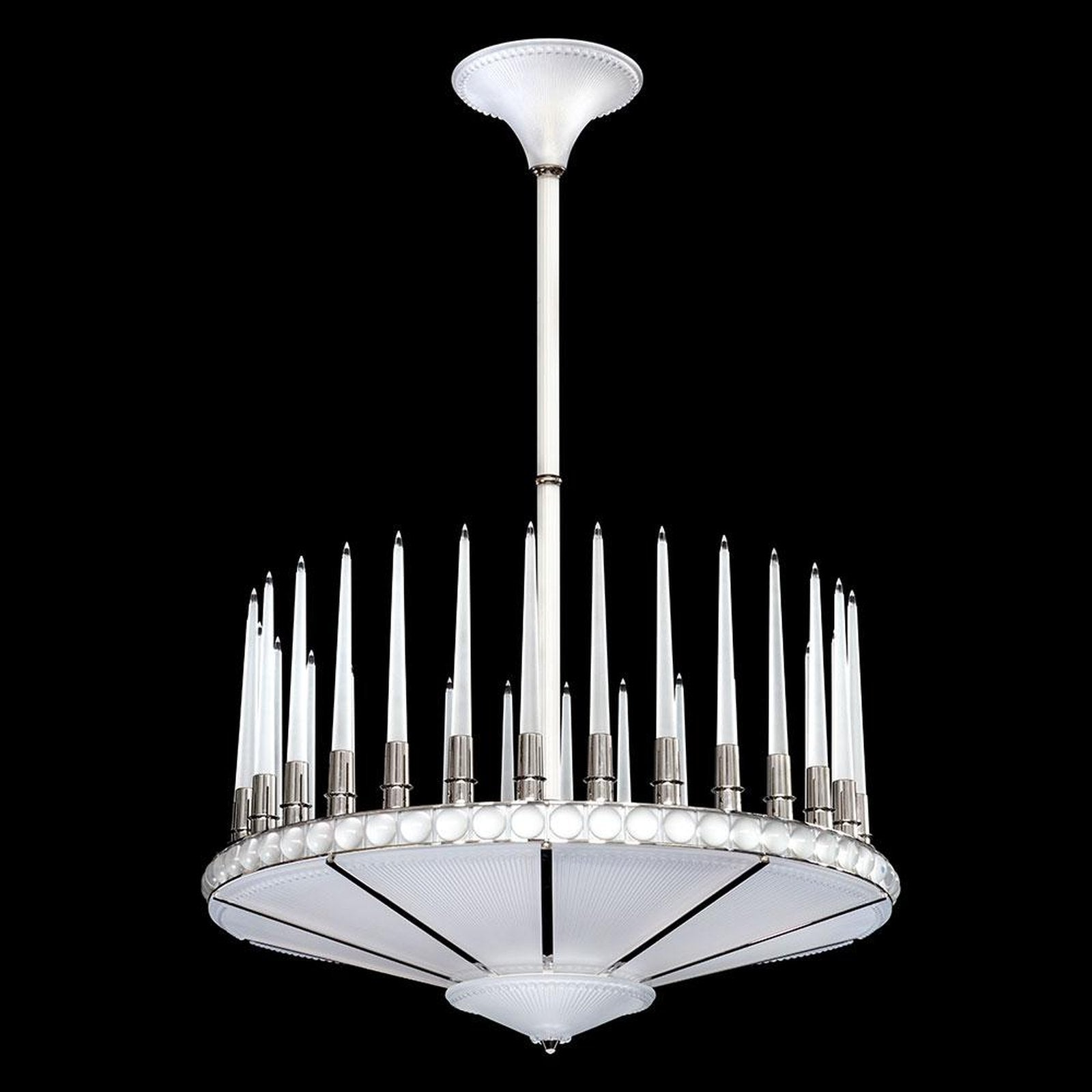 Carved with stripes and cabochons with the satin finish emblematic of Lalique, the crowns of light are adorned with slender crystal candles, arranged in a rhythmic rigor. Metal sublimates the purity and brilliance of crystal.