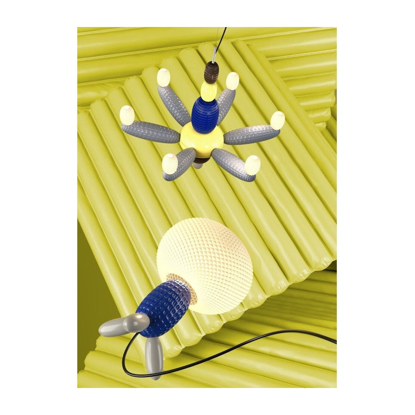 The chandelier is made up of a series of translucent matte porcelain 'balloons' with different textures and colors.