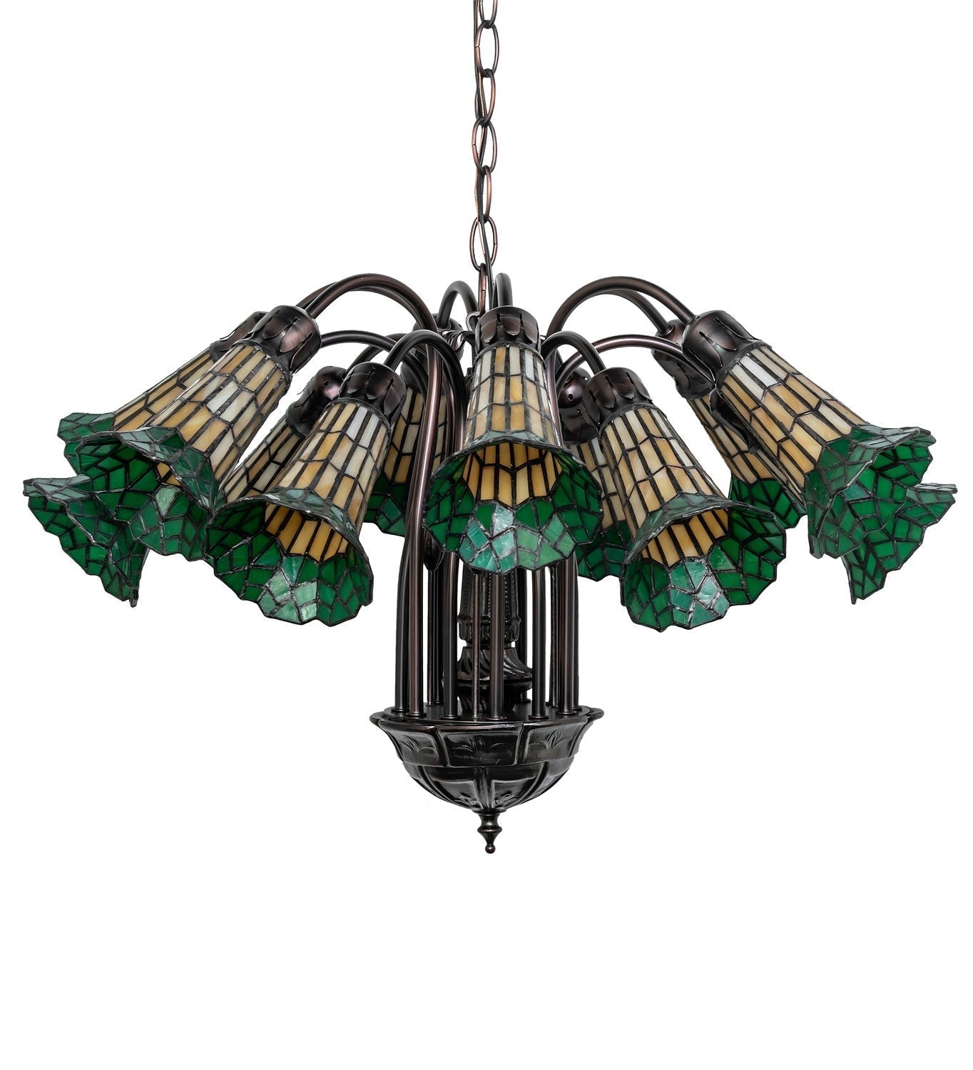 Inspired by the famous Tiffany design from the early 1900s. This chandelier features 12 stunning Amber and Green stained glass shades created using the famous Meyda Tiffany copperfoil construction technique. An elegant cast metal hub and arms embrace the shades with fitters finished by hand in Mahogany Bronze. Inspired by antique lighting in homes from the Bowery in New York City, to Philadelphia, Pennsylvania, to San Francisco, California. The overall height ranges from 18 to 53 inches, as the chain can easily be adjusted in the field to meet your exact requirements. Ideal for installation above a dining table, in a foyer, and above a kitchen table. The Stained Glass Pond Lily Chandelier is included in our American-designed, handcrafted Stained Glass Lighting Collection. UL and cUL listed for dry and damp locations. Each shade is a unique work of art with color variations based on natural ingredients inherent in the glass.
