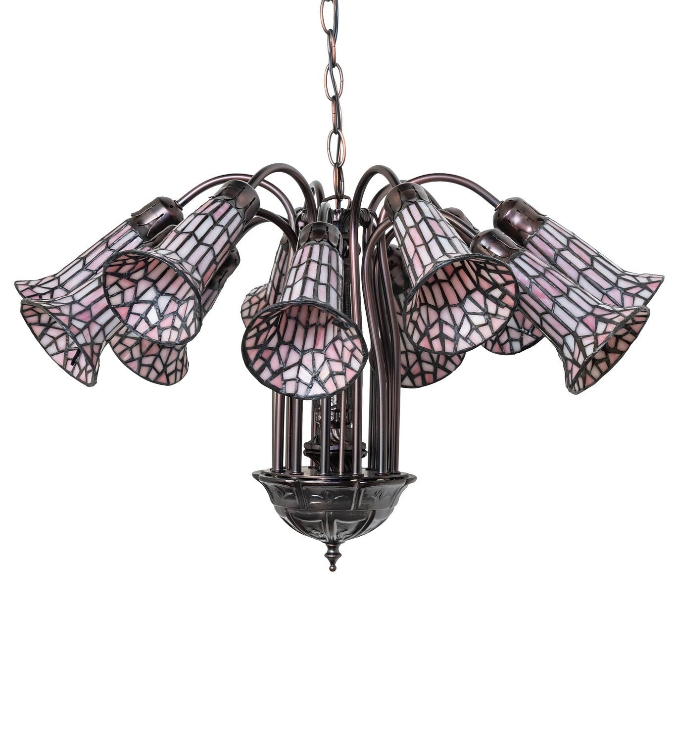 Inspired by the famous Tiffany design from the early 1900s. This chandelier features 12 stunning Pink stained glass shades created using the famous Meyda Tiffany copperfoil construction technique. An elegant cast metal hub and arms embrace the shades with fitters finished by hand in Mahogany Bronze. Inspired by antique lighting in homes from the Bowery in New York City, to Philadelphia, Pennsylvania, to San Francisco, California. The overall height ranges from 18 to 53 inches, as the chain can easily be adjusted in the field to meet your exact requirements. Ideal for installation above a dining table, in a foyer, and above a kitchen table. The Stained Glass Pond Lily Chandelier is included in our American-designed, handcrafted Stained Glass Lighting Collection. UL and cUL listed for dry and damp locations. Each shade is a unique work of art with color variations based on natural ingredients inherent in the glass. Please contact us if color matching is critical when ordering multiple items.