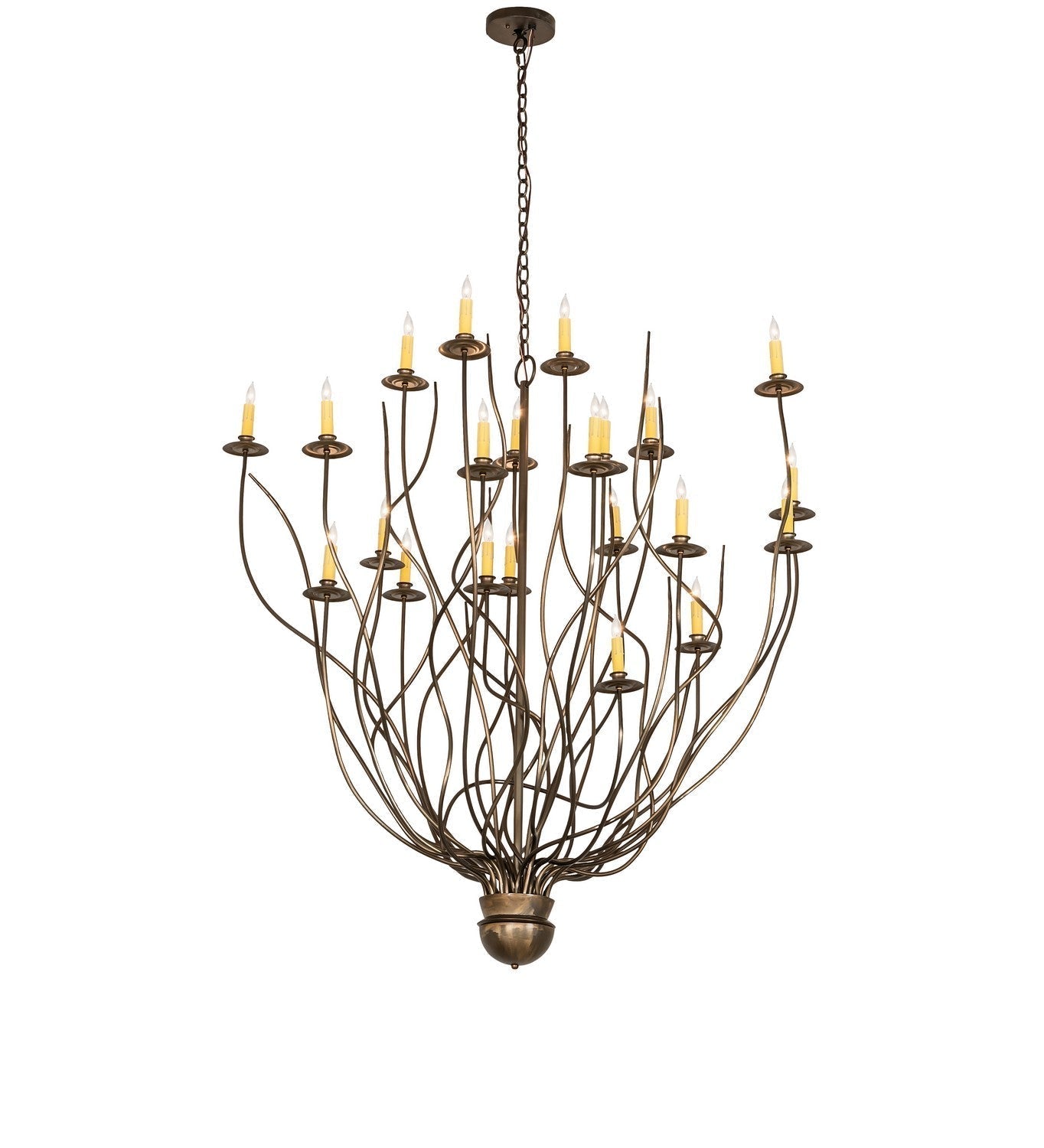 An elaborate chandelier designed with a dramatic look, this lighting fixture is inspired by the Sycamore tree--a symbol of protection, eternity, and strength representing Egyptian goddesses to the tallest trees in New York City. Organically fashioned metal branches finished in Antique Copper appear to grow in various directions like those from natural trees. Twenty-two metal arms embrace Ivory faux candlelights perched on bobeches for beautiful ambient illumination in fine homes and hospitality spaces, from Robbinsville, North Carolina, to Green Bay, Wisconsin. The Sycamore 22 Light Chandelier is featured in our American-made, American-designed, handcrafted Nature Inspired Lighting Collection. This fixture is manufactured in Yorkville, New York. UL and cUL listed for dry and damp locations.