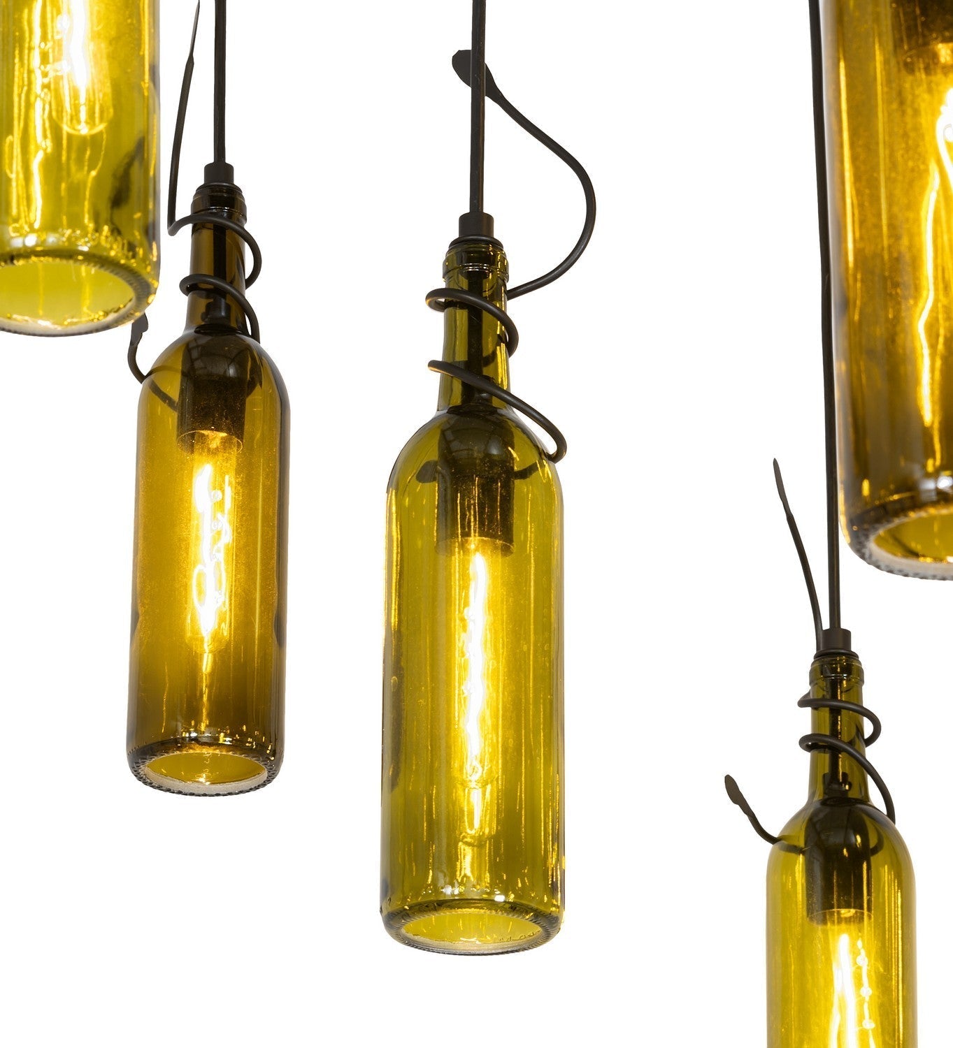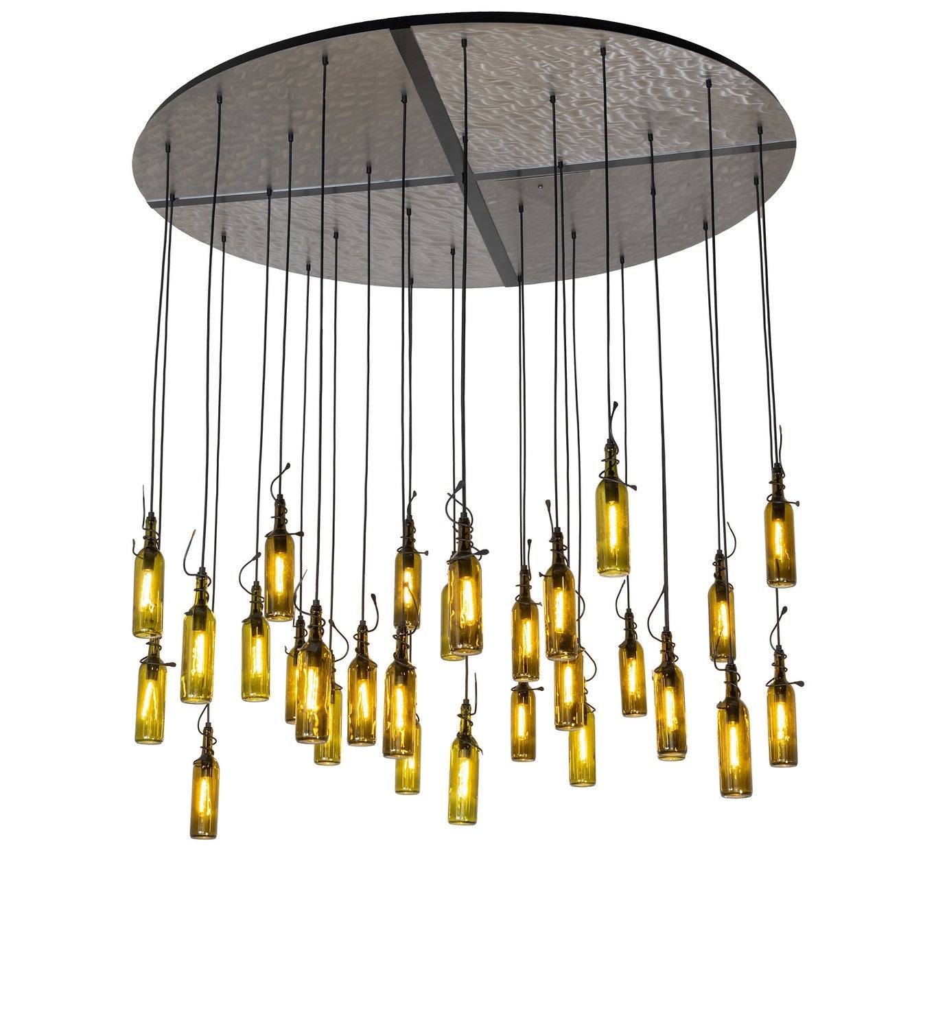 Capture the life of the party with the whimsical design of the Meyda Wine Bottle Pendant. So much fun that you may want to hang from it, but don't! Liven up a restaurant, club, or home with a light fixture that does so much more than deliver light, it adds personality and pizzazz. 30 Green wine bottles are suspended with Black wire and graceful vine-like accents embraced by a massive round canopy. The stunning canopy is made by hand with special metal conditioning tools to apply a pattern that reveals a stunning refracted effect through the superior protective clear coat. Perfect for entryways and other spaces in homes, restaurants, hotels, pubs, nightclubs, wineries, and retailers, this fixture will be appreciated for its fine detail and charm by connoisseurs from Washingtonville, New York, to Bluemont, Virginia, to Napa Valley, California. The overall height ranges from 14 to 74 inches, as the Black cords can be adjusted to meet your exact lighting requirements. This rich-looking Tuscan Vineyard Wine Bottle Chandelier is included in our American-made, American-designed, handcrafted Wine Bottle Lighting Collection. The fixture is manufactured in Yorkville, New York. UL and cUL listed for dry and damp locations. Take your finest bottle of wine, and Meyda will transform it into an everlasting personalized fixture of light. Contact us for more information on custom wine bottle lighting fixtures and lamps. You can also create custom lighting with beer bottles, mason jars, milk bottles, and other glass containers and vessels by contacting us!