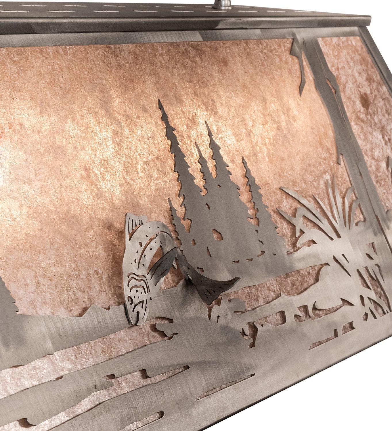 The North Woods Trout is depicted on this rustic tree and branch accented billiard and kitchen island ceiling pendant. Handmade in the USA by Meyda Tiffany craftsmen, this fixture is hand finished in Steel and featured with a stunning Silver Mica shade.