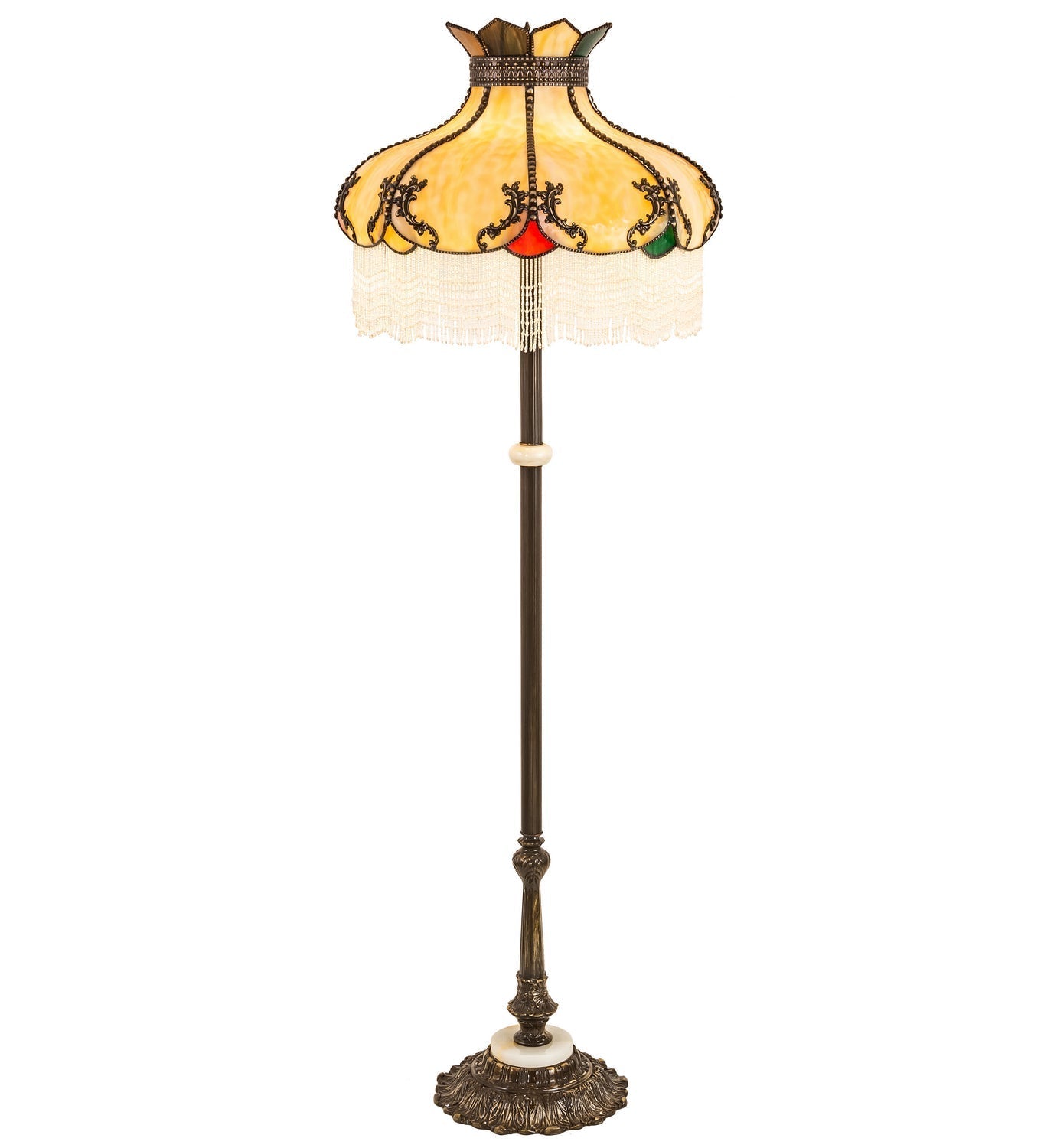 Embrace the timeless look of this classic art glass lighting design. The Elizabeth floor lamp features a hand-curved Beige Opal Art Glass shade with Cathedral Red, Green, Blue and Beige scalloped designs. The shade is enhanced with Brass filigree hand finished in Craftsman Brown, highlighted to reveal an eye-catching dimensional look. The lovely shade also is accented with White hand-beaded glass fringe. The Antique Brass Gloss powder coated lamp base is complemented with White onyx accents. The Quality Bent Glass division of Meyda Tiffany Lighting is over 100 years in the making. Today we are still creating timeless masterpieces using tools and methods from the days when we supplied Tiffany Studios. UL & cUL listed for dry locations.