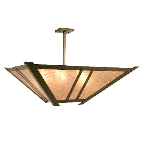 Dramatic styling is integrated with an American Craftsman look. A stunning shade featuring Silver Mica touts a straight-line metal accents and hardware design in a Chestnut finish. The pendant is handcrafted in the manufacturing facility in Upstate New York, and is available in custom colors, styles, sizes and dimmable energy efficient lamping options such as LED. This 42-inch wide ceiling fixture is UL and cUL listed for dry and damp locations.