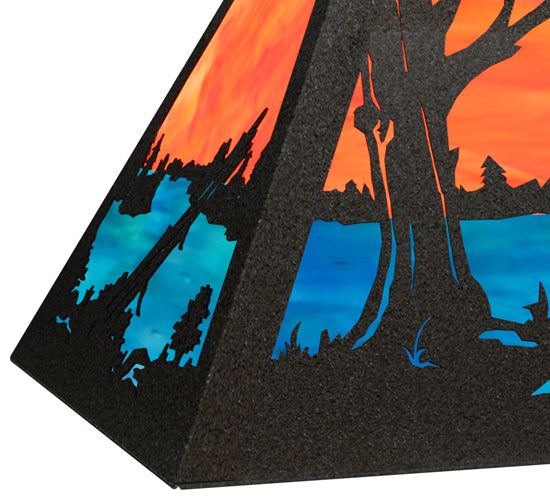 A stunning design depicts a Deer gracefully scampering across the lakeside woods as the glorious morning sun rises in the backdrop of this eye-catching scene. Beautiful ambient illumination shines brilliantly across a Sunburst colored art glass sky above gleaming Blue-Green glass waters. Textured Black finished hardware complement this oblong pendant. Perfect for lighting an island, counter, bar, billiard table or other space. Overall height ranges from 18 to 43 inches as the chain length can be easily adjusted in the field. Made to Order in our facility at the foothills of the breathtaking Adirondack Mountains. Shade colors, metal finishes and pendant sizes can be customized. UL and cUL listed for damp and dry locations.