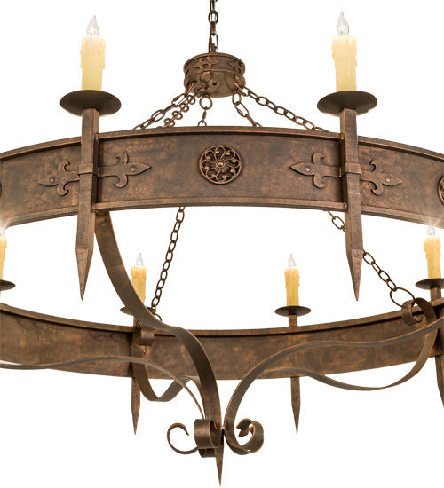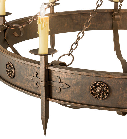 Calandra brings together a luxurious charm and a rich artistic look. Floral medallions and other decorative motifs accentuate this stunning steel chandelier featuring 10 exquisite Amber faux candlelights perched on bobeches. The fixture is enhanced with sturdy, detailed hardware and a scrolled finial featured in a handsome Gilded Tobacco finish. The fixture is ideal for entryways, dining areas, and other rooms in a variety of residential and commercial settings. The chandelier is handcrafted by our artisans in Upstate New York, in the USA. Options include dimmable energy efficient lamping such as LED, as well as custom sizes, styles and colors. This fixture is UL and cUL listed for damp and dry locations.