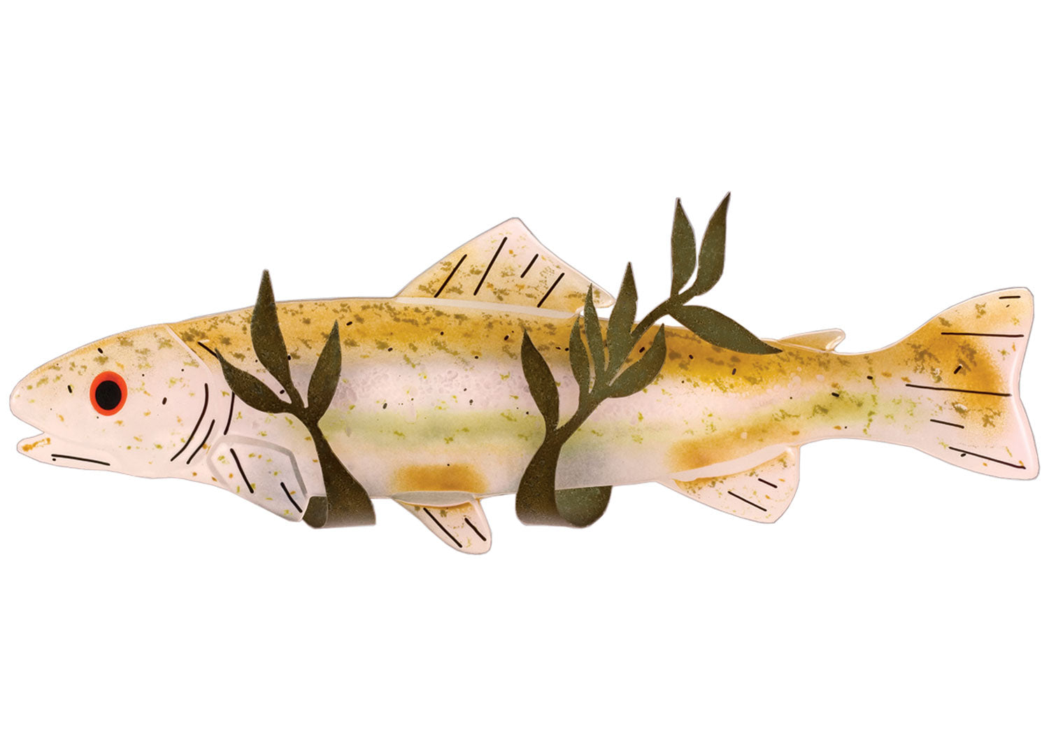 The Trout Wall Sconce offers an innovative and striking Fused Art Glass design in our popular Metro Fusion Group. Handcrafted in colors of Pink, Amber and Green, it is accented with Red and Black eyes, on metal Olive Green leaves. The finish is Tarnished Copper. A true work-of-art, ideal for sportsmen, outdoor enthusiasts and those that appreciate a work of beauty.