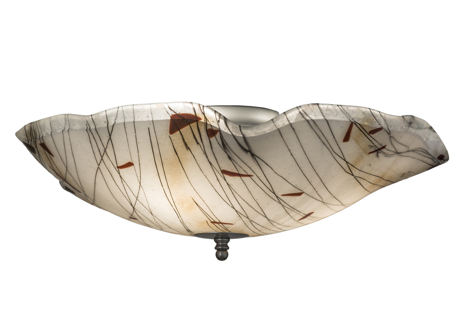 Italian for small branches or twigs. The Ramoscelli ceiling fixture features an abstract expressionist lighting design. Inspired by bare trees against a Winter White sky, this inverted shade highlights our innovative Fused Glass. White iridescent glass is fused with Black Twig-like streamers with Plum colored accents and Bronze Frit sprinkled across the shade. Ideal for foyers, corridors and other spaces in a variety of residential and commercial settings. Traditional workmanship, high fire kilns and original tools are used to fuse glass in our 180,000 square foot manufacturing facility in Yorkville, New York. Diffuser colors, metal finishes and fixture sizes can be customized to your needs. UL and cUL listed for dry and damp locations.