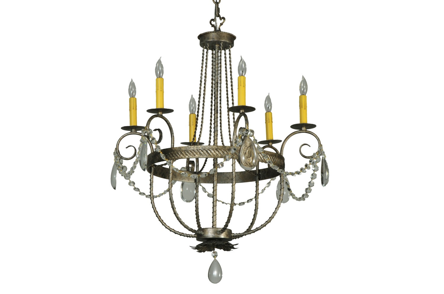 Exquisite styling and luxurious charm are reflected in this 6-light chandelier. This fixture combines faceted crystal charms, textured scroll arms, an Acanthus leaf accent and rich Corinth finished hand-forged hardware. This elegant chandelier embraces 6 Amber faux candlelights. This chandelier features quality materials and hand detailed American craftsmanship perfected by years of time honored artistry, passed down from generations of highly skilled artisans. Custom sizes, styles, colors and dimmable energy efficient lamping options such as LED are available. The fixture is UL and cUL listed for damp and dry locations.