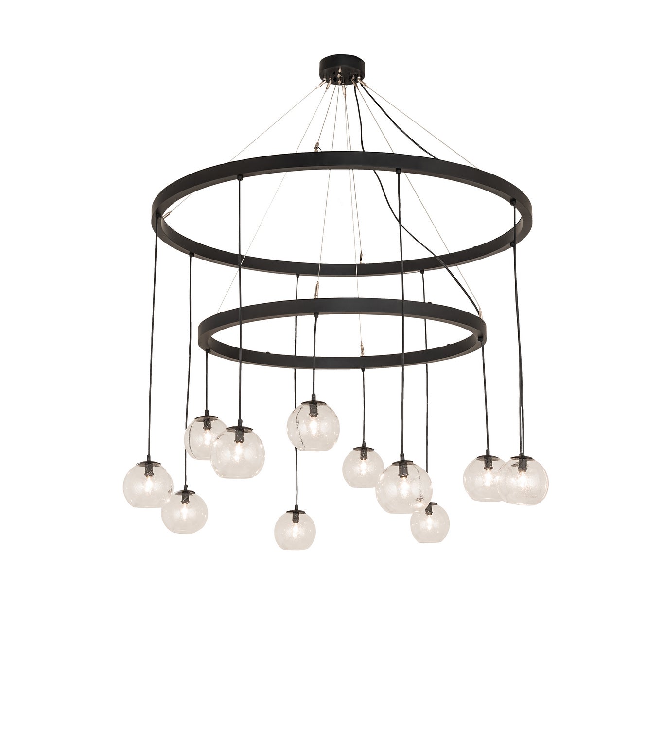 Innovation and imagination are integrated for a stunning decorative lighting look. A captivating illuminating design, this cascading chandelier displays 12 Clear Seeded Glass globes. The Bola orbs reveal customer-supplied Edison bulbs attached to hardware featured in a Solar Black finish. The chandelier is perfect for foyers, lobbies, and other spaces with tall ceilings. The Bola Chandelier is featured in our American-made, American-designed, handmade Modern Lighting Collection and manufactured in Yorkville, NY. UL & cUL listed for dry and damp locations.