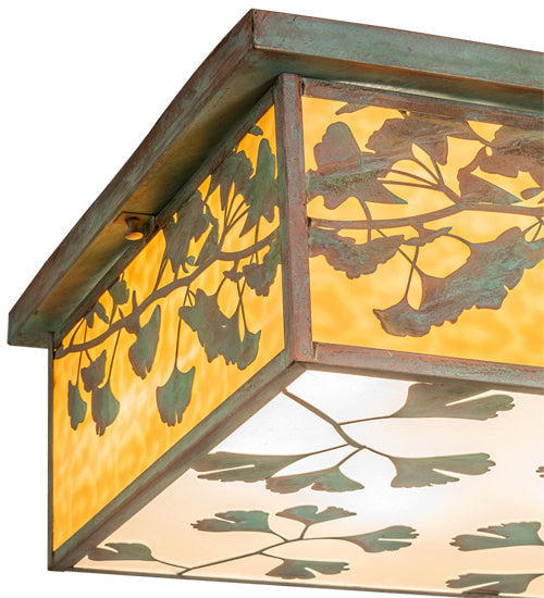 Nature-inspired elegance meets luxurious sophistication for a dramatic upscale design statement. This stunning ceiling fixture features Verdigris finished Brass Ginkgo Leaves and hardware. The side panels are offered in Beige Flemish Glass which is enhanced with a Clear Seeded bottom diffuser. The Hyde Park Ginkgo Flushmount is featured in our American designed, handmade Craftsman Signature Series. Manufactured in Yorkville, New York. UL and cUL listed for dry and damp locations.