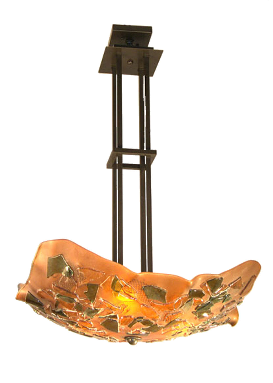 Hide beside the Metro Fusion, Urban Camo inverted pendant is the coolest look in Hot glass. Hand cut glass is fused and hot fired to fall into a crinkle draped shape. Handmade by Meyda Craftsmen, the shade of Amber and Olive camouflage colored glass with metal mesh accents hangs from Timeless Bronze finished hardware.