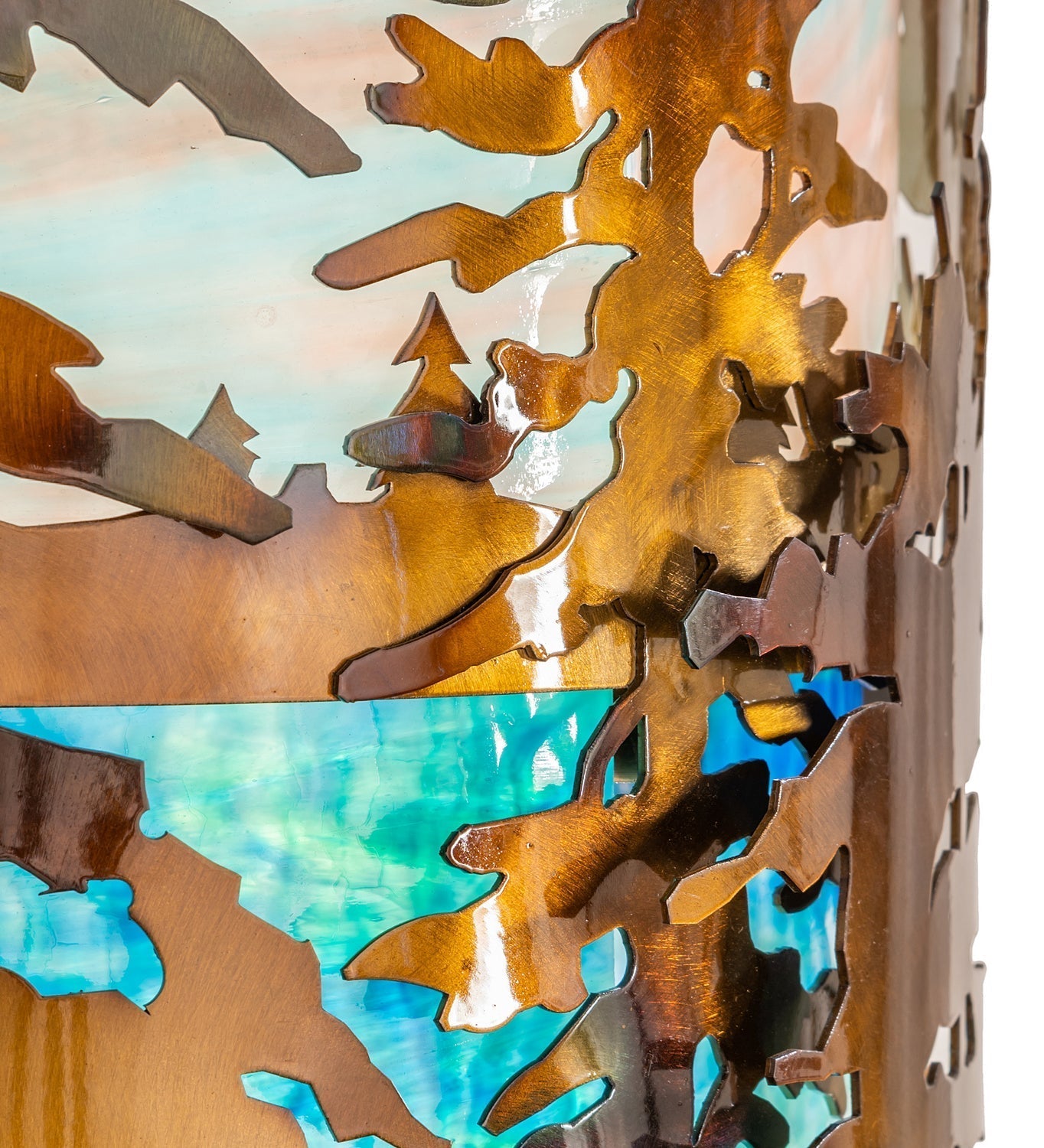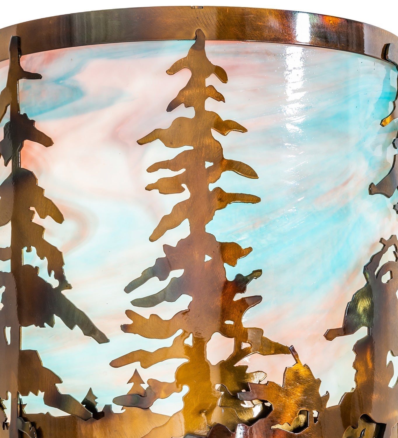 This curvaceous sconce features mesmerizing Pine Tree silhouettes that stand tall as the brilliant morning sun rises above a brilliant mountain lake in the background. Beautiful ambient light is projected through a stunning Purple, Blue and Green art glass diffuser which is complemented with decorative accents and hardware featured in a Light Burnished Transparent Copper finish. Ideal for illuminating hallways, dining areas and other spaces in residential, hospitality and commercial settings. The Tall Pines Wall Sconce is featured in our American made, American designed, handcrafted Nature Inspired Lighting Collection. Manufactured in Yorkville, New York. UL and cUL listed for dry and damp locations.