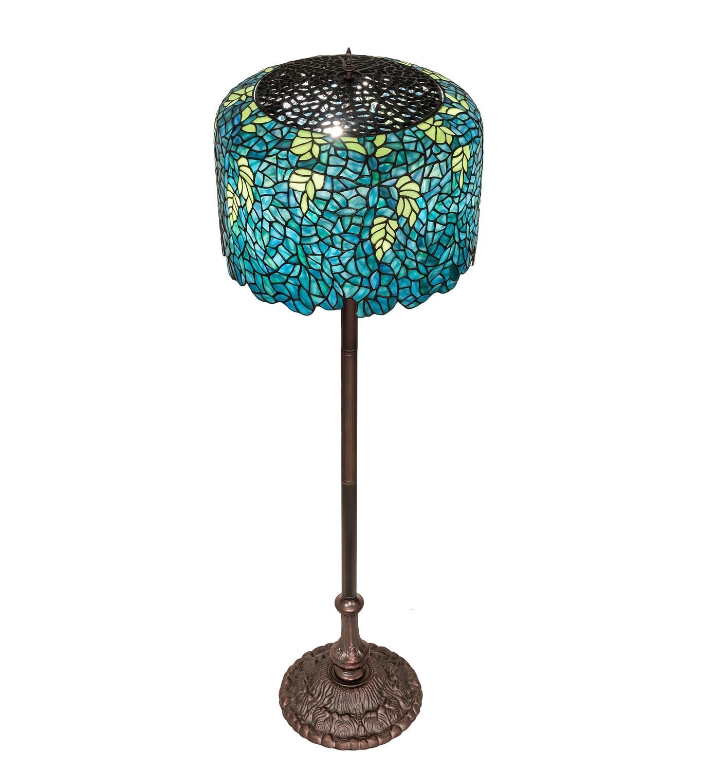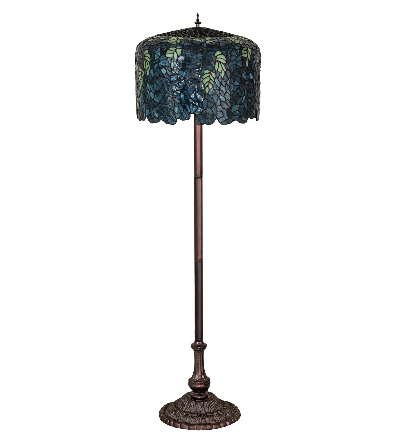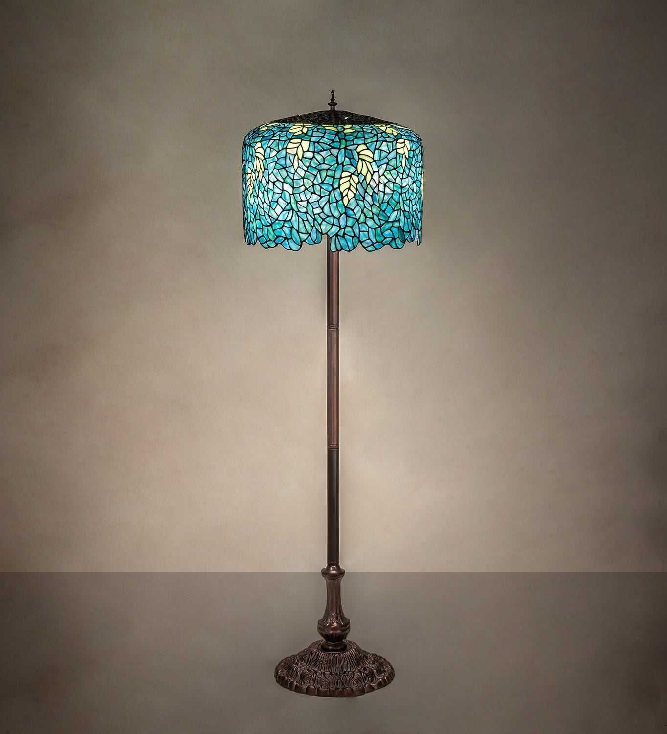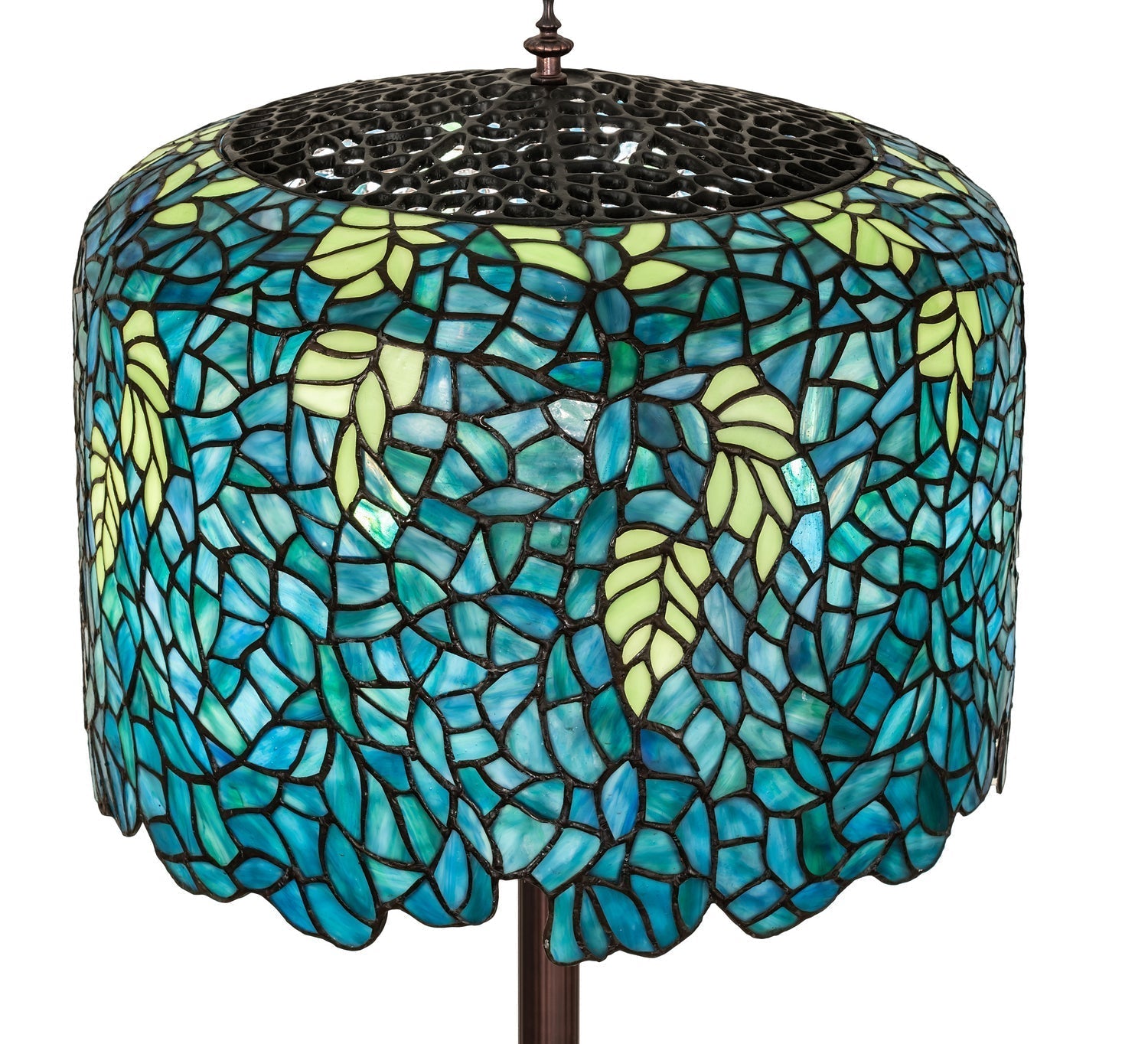Recreating the popular Wisteria art glass design created by Louis Comfort Tiffany more than a century ago... This Wisteria shade features undulating edges with clusters of Green/Blue petals amid Spring Green leaves. The shade is created using the famous Meyda Tiffany copperfoil construction technique and enhanced with a Mahogany Bronze finished floor base. The Tiffany Wisteria Floor Lamp is featured in our American designed, handcrafted Tiffany Reproduction Collection. UL and cUL listed for dry locations. Each shade is a unique work of art with color variations based on natural ingredients inherent in the glass. Contact us if color matching is critical when ordering multiple items.