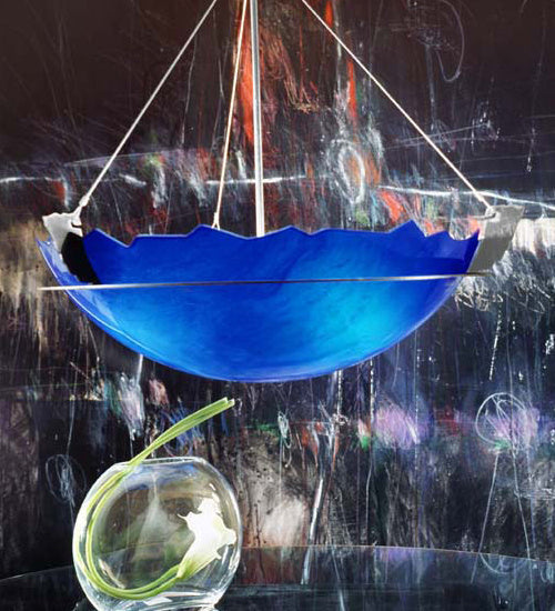 A stunning lighted piece of art, Azul embodies variegated Cobalt Blue art glass or Idalight in a crescent profile with a serrated cutting-edge look that both inspires and dazzles. Hardware and aircraft cables are featured in a Pewter finish. Custom crafted in the USA, this fixture is available in custom colors, designs and sizes, as well as dimmable energy efficient lamping options. The 30-inch wide fixture is UL and cUL listed for damp and dry locations.