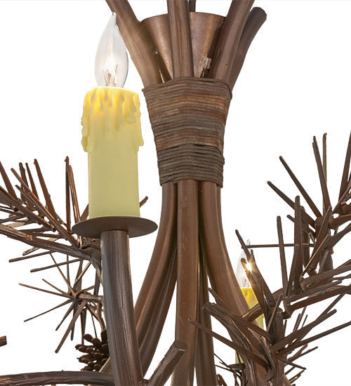 Meyda artisanship embraces Mother Nature. An illuminating 6 light candelabra with Faux Ivory candlelights appears to bud and grow from steel branches with pinecones and pine needles. Decorative accents and hardware are hand finished in Wrought Iron over Mahogany Bronze. This nature inspired fixture is custom crafted by Meyda artisans in our manufacturing facility upstate New York at the foothills of the Adirondack Mountains. Custom sizes, styles, colors and dimmable energy efficient lamping is available.