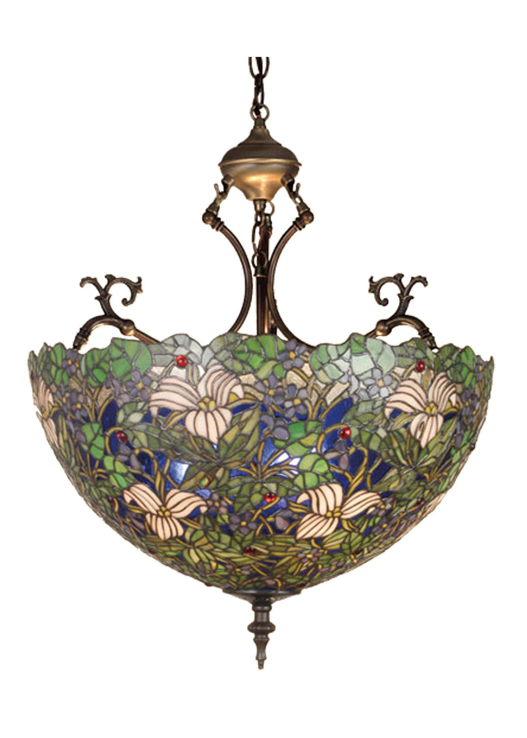 Nature abounds in this Meyda Tiffany designer stained glass shade. Glistening ruby red berries, Ivory trilliums and clusters of Purple violets with Woodland Green leaves make a lacework of wildflowers against a Cobalt Blue forest sky. Each piece of glass in the shade is hand cut and wrapped in copper foil. The inverted pendant hardware is hand finished in Mahogany Bronze.