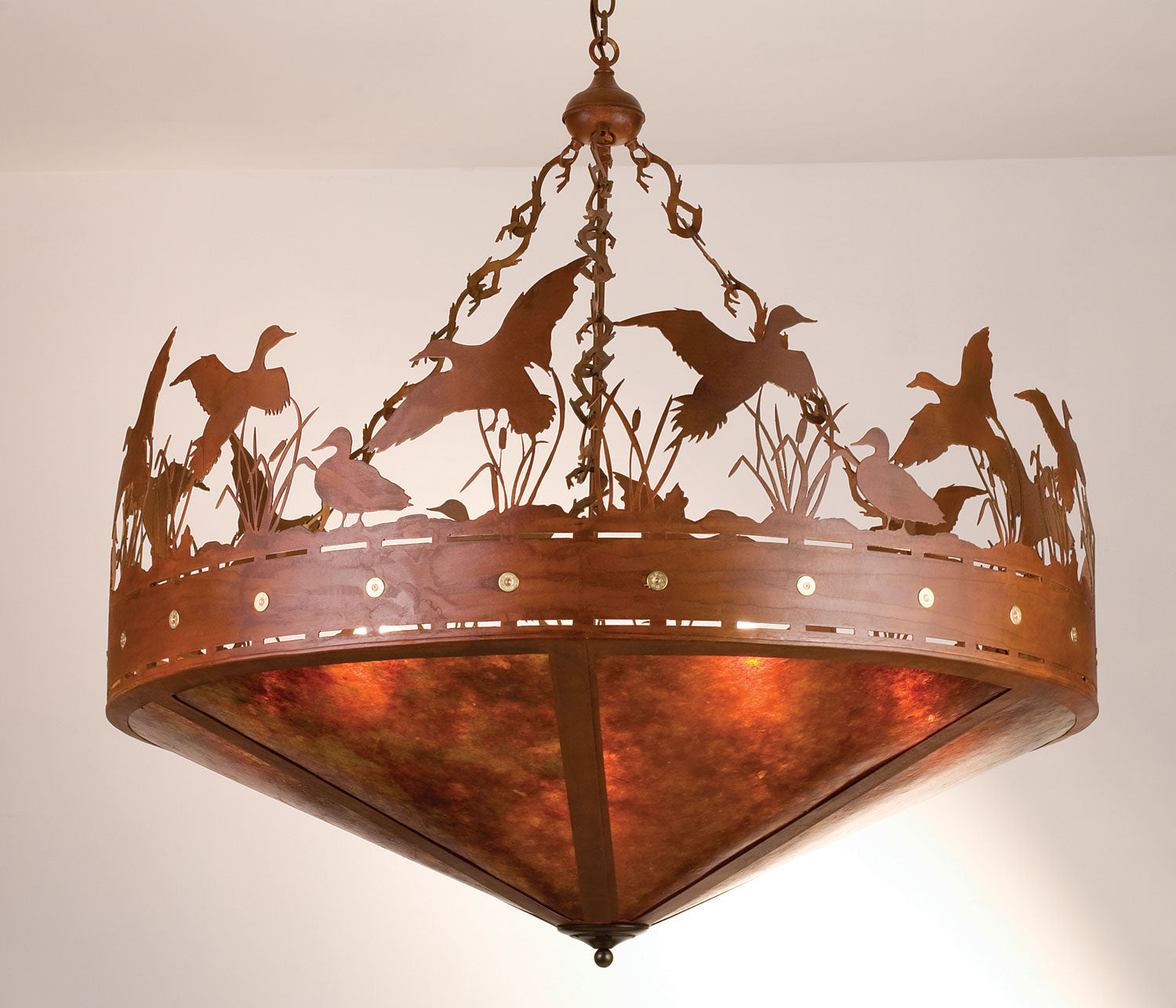 A flock of Ducks in and above cattails and marsh grasses top this wildlife inspired original pendant handcrafted in the USA by Meyda artisans. Suspended from hand crafted branch like chain links the bullet accented band and Ducks top Amber mica panels. This fixture has a Rust finish.