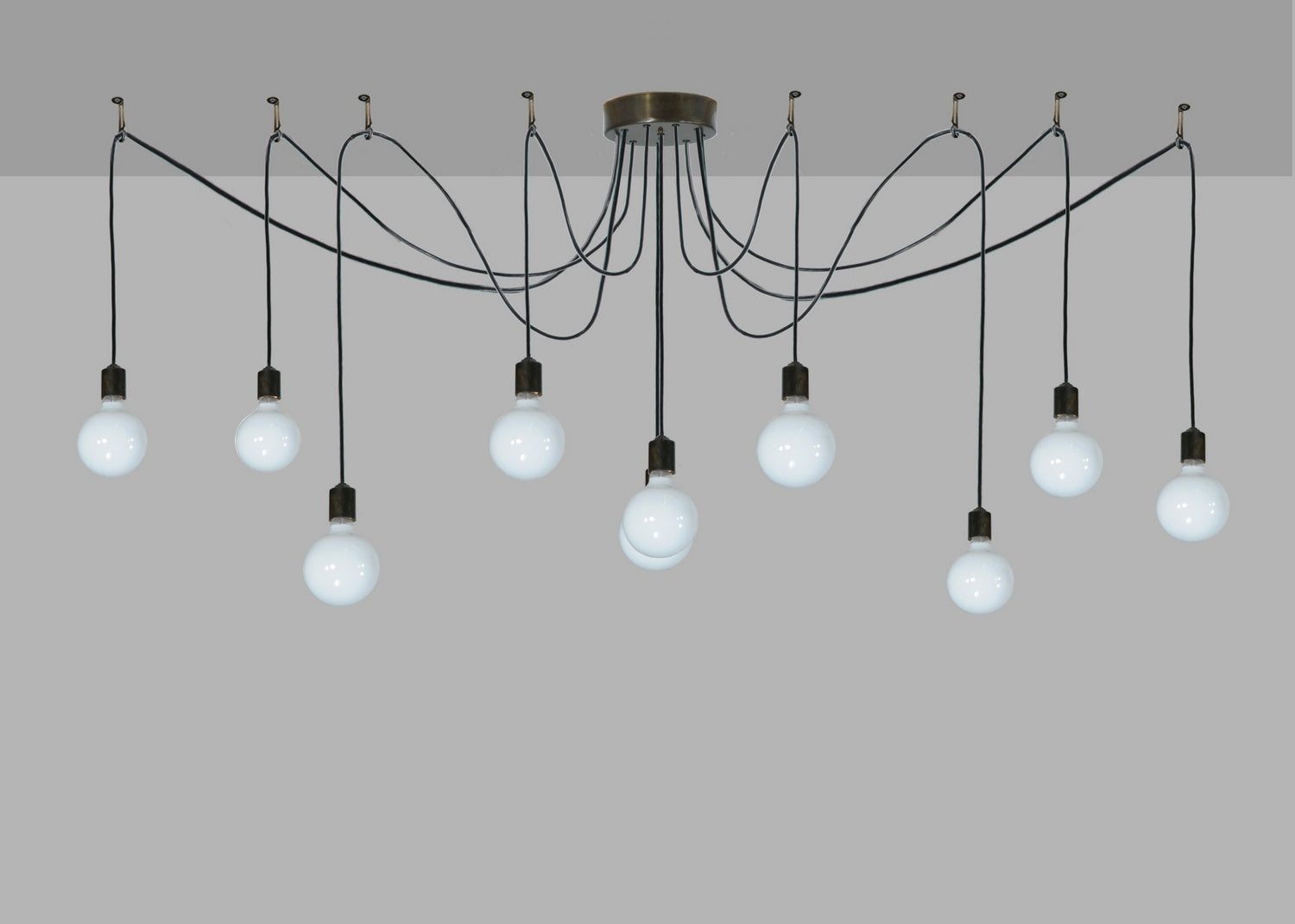 Designed like a festive garland of party lights for a special occasion or ambience in a residence, lounge or restaurant. Castiliolite features 10 Edison lamps draped with Black cords from the ceiling canopy. Custom crafted in our manufacturing facility in Upstate New York, this pendant is available in custom styles, sizes and finishes. Dimmable energy efficient lamps such as LED are also available. UL and cUL listed for dry and damp locations.