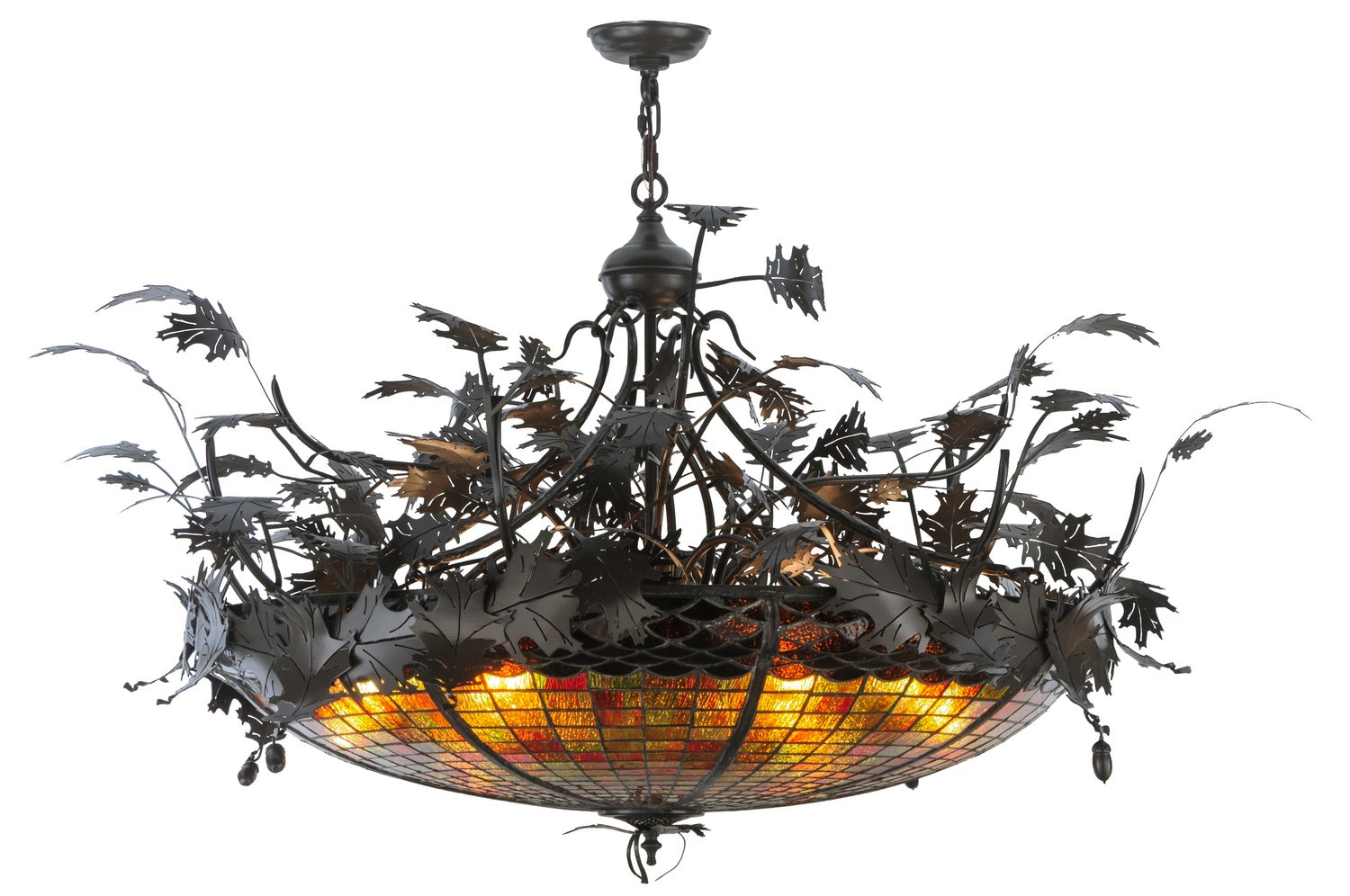 Visually impressive as the mighty Oak Tree, this art glass shade is featured in Multi-toned Autumn Green/Browns, Beige, Browns and Red Waterglass. The shade is crowned with Bark Brown granite glass sprouting metal Oak leaves, Branches and Acorns in a Timeless Bronze finish. The shade is created using the famous Meyda Tiffany copperfoil construction process. Overall height ranges from 34 to 69 inches as the chain can be easily adjusted in the field. Domestically Produced in our 180,000 sq ft manufacturing facility in Yorkville, NY. Customize diffuser colors, metal finishes and sizes. UL and cUL listed for dry and damp locations. No two art glass shades will be the same as their individuality can be as remarkably unique as their personality.