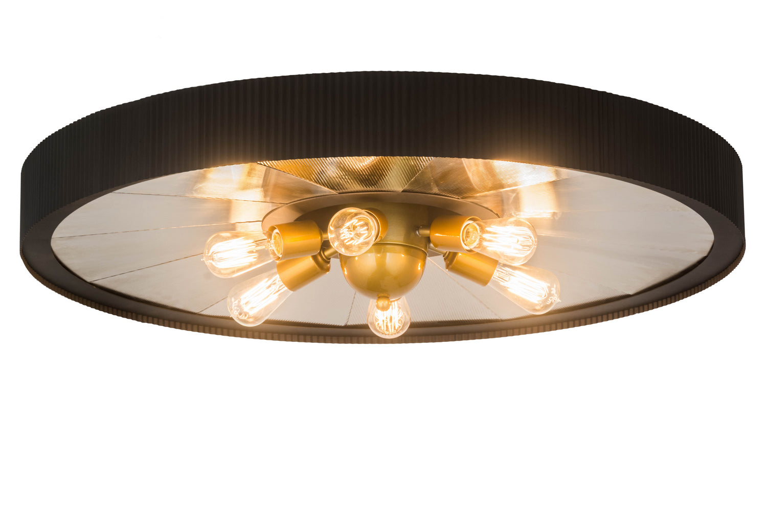This ceiling fixture is designed with a unique Corrugated Steel frame in a Costello Black finish which surrounds a highly polished corrugated stainless steel reflector. Ambient light is projected from six Edison styled lamps embraced by a six-light cluster in a Brass finish.Custom designs, colors and sizes are available, as well as dimmable energy efficient lamping.This fixture is UL and cUL listed for damp and dry location.