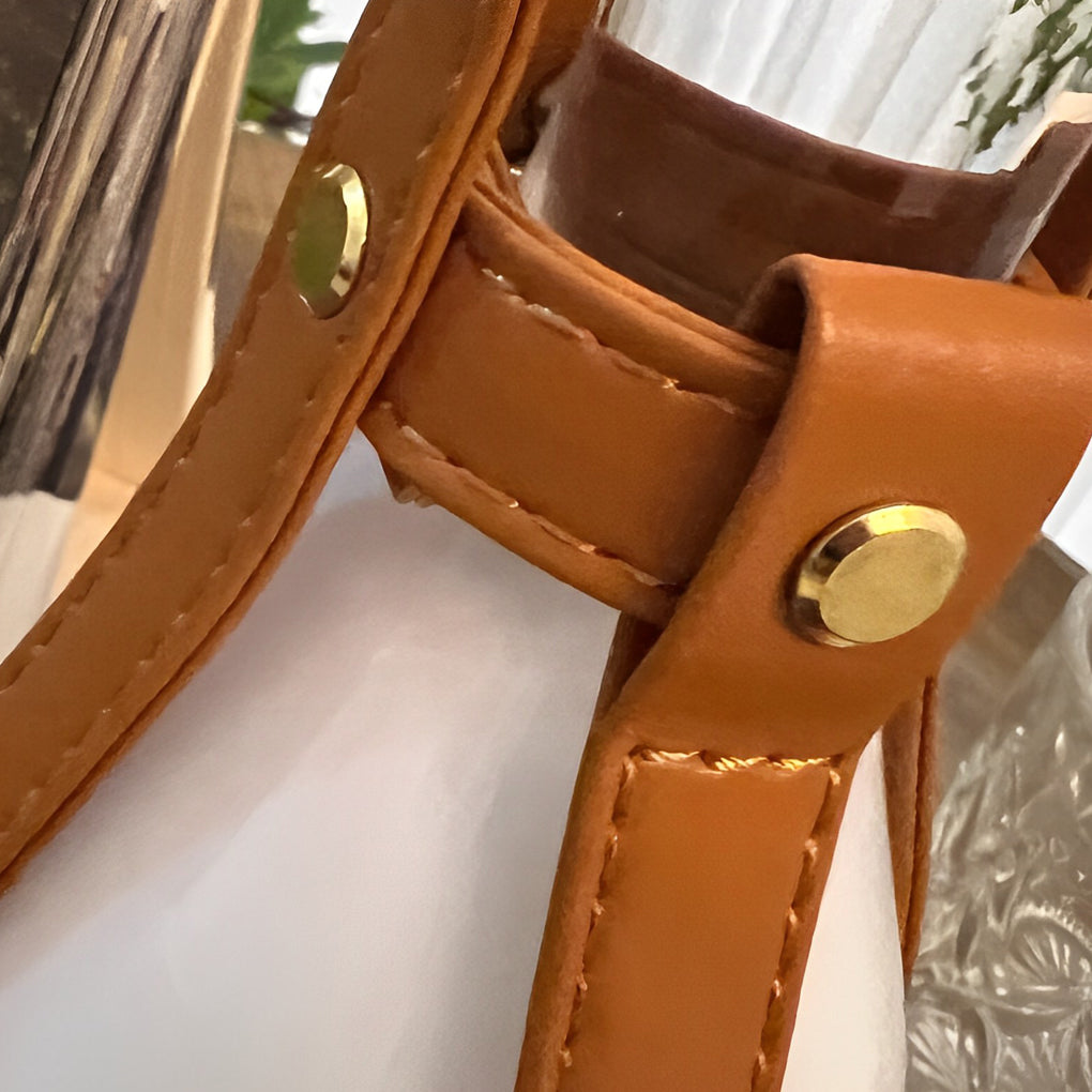 - This classic modern mid-century lantern table lamp features a plain shade hand-crafted from frosted process of soft glass. The warm tones of honey and cream along with milk glass enhance the pyramid-topped round base in PU leather handle and belt finish.