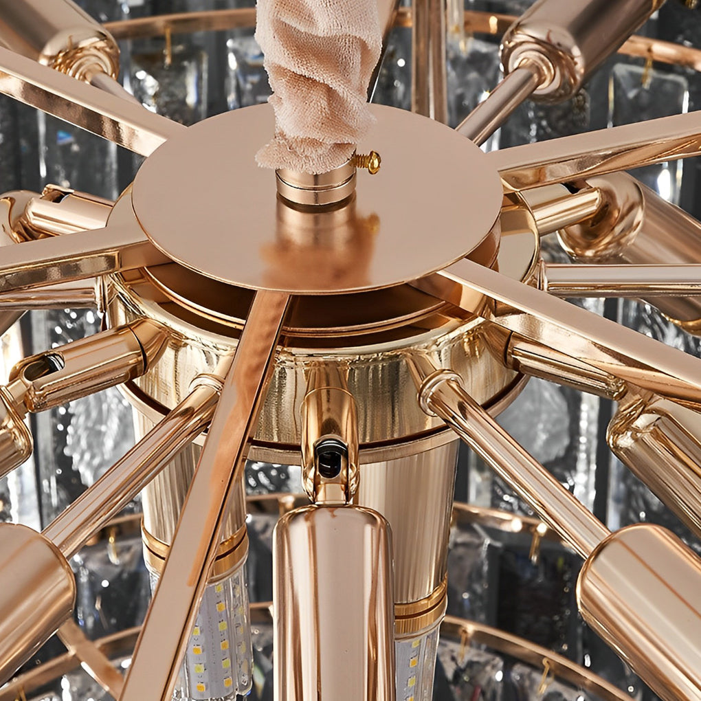 - This crystal chandelier combines classic and modern elements to stunning effect. Its electroplated hardware light frame is inlaid with quality crystal strips, adding modern elegance and charm to your home.