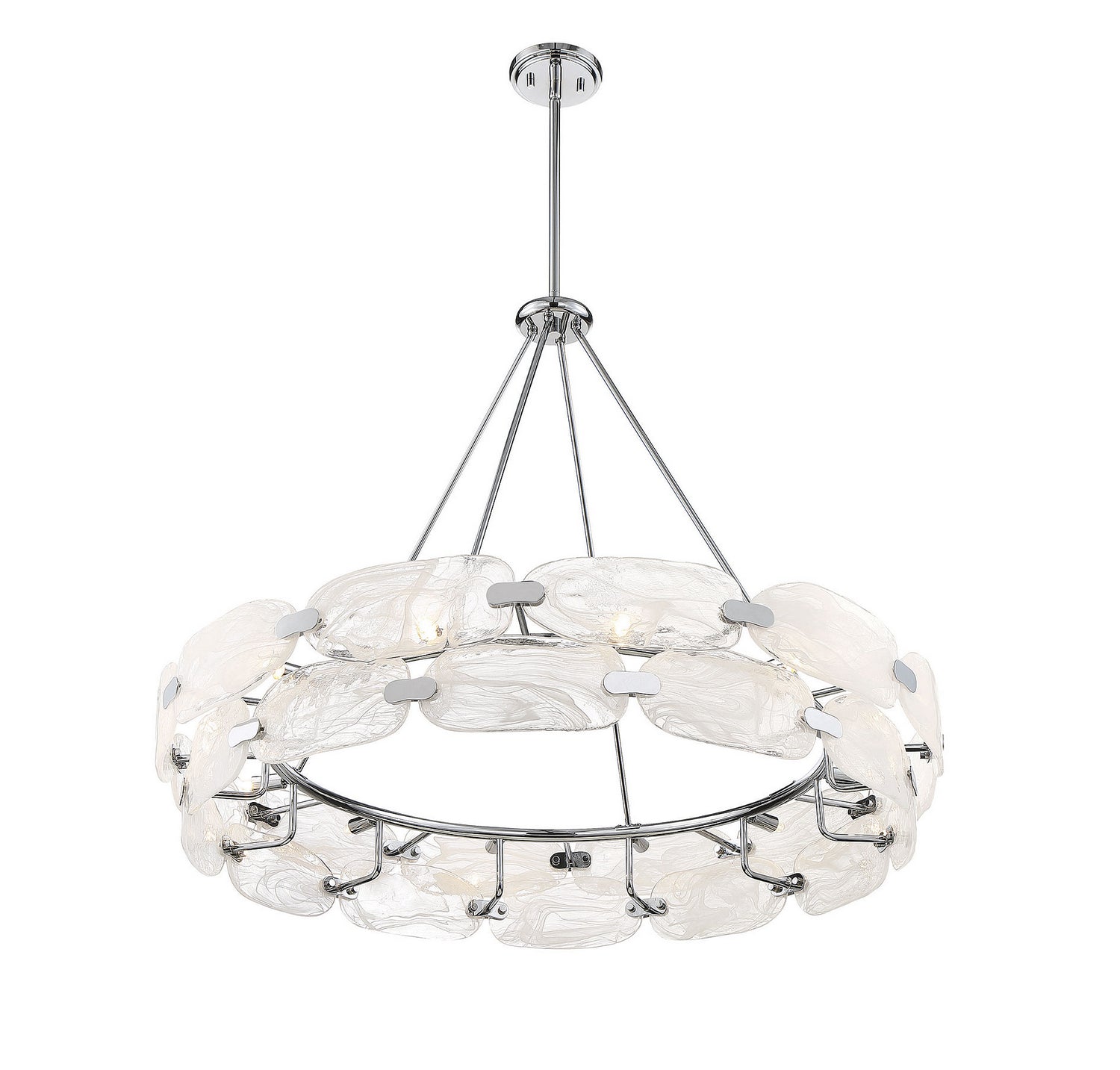 For a truly beautiful and unique lighting look, consider bringing in the Vasare 12-light pendant from Savoy House. Its sleek, contemporary circular shape flaunts a ring of hand-made marble glass, each pane showcasing totally unique swirls, united by a simple structure that is finished in chrome. It is often said that lighting is the jewelry of the home and Vasare, with its stunning glass and metal clasps, is a perfect example of this saying! Great for use in a wide variety of spaces, such as kitchens, living rooms and even entryways. This fixture is 38' in width and has an adjustable height that ranges from 37' to 83'.