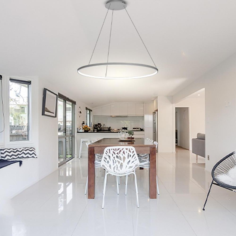 - This Starto Pendant Light features a simple contemporary style with an oversized big ring shape. The integrated LED pendant provides sufficient illumination in your special space, it comes with 38 energy watts, 3000/4500K and 161 sq.ft-215 sq.ft illumination area. This pendant light takes a three metal cable hanging design that is very strong and stable. The LED fixtures are very thin but more energy efficient and last much longer than traditional incandescent versions. The opal shade pendant makes an excellent solution for living room lighting, dining lighting and hallway lighting.