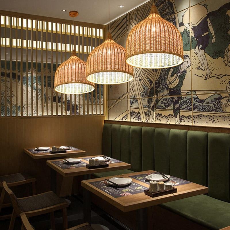 - A semi-circle rustic bell-shaped rattan pendant light with a pointy top, it is also quasi transparent with the environment-friendly LED bulbs being slightly visible through the many tiny holes in the lamp.