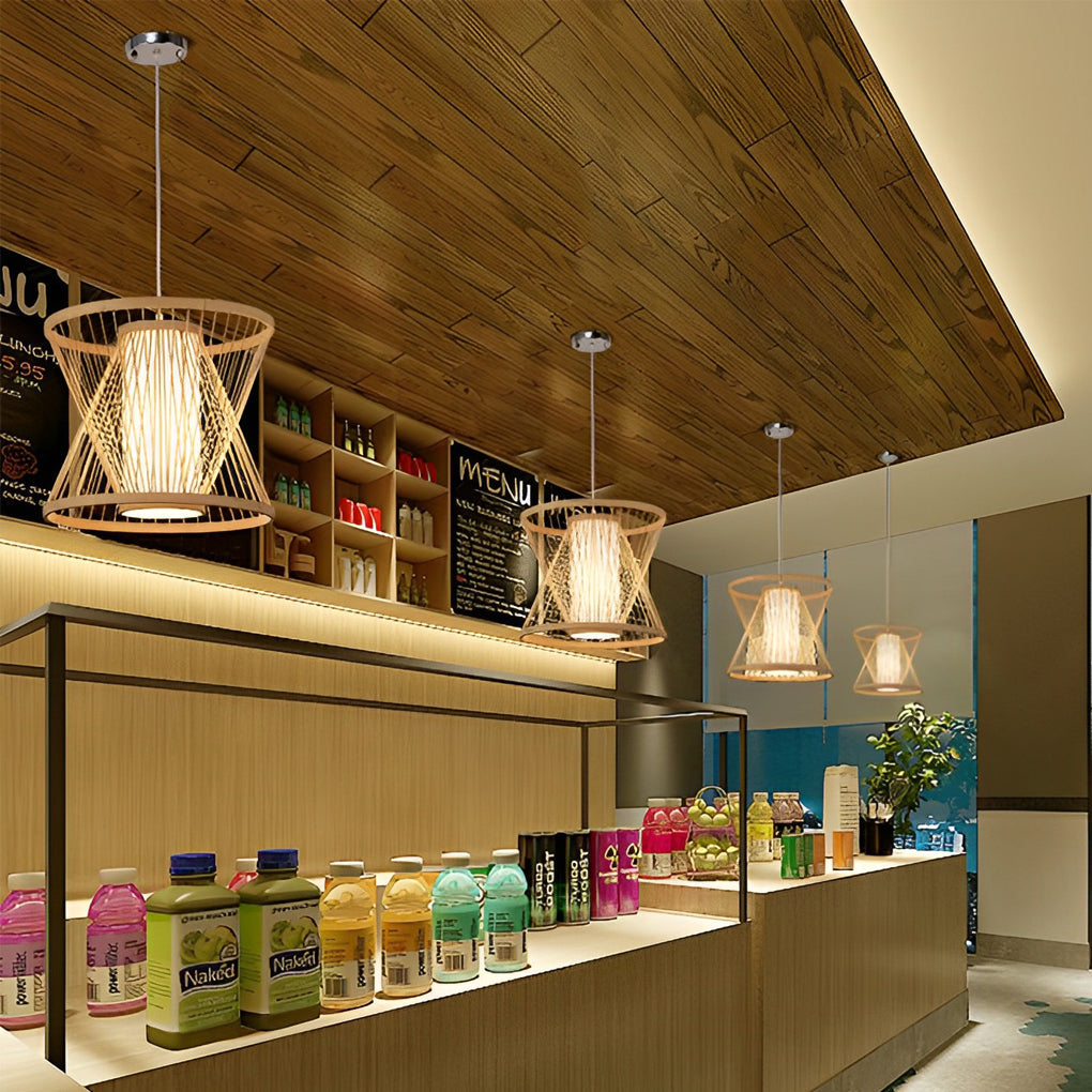 - In this particular range of bamboo ceiling lights, the actual light shades are what delivers the beauty and aesthetic contribution. The thin but long version will provide an abundance of light. It will also look mesmerizing if placed in bulk with pendant lights of the same kind. You also have the intertwined cone variation. With this pendant light, you have light reflected in multiple directions around the room making it great to bring people together.
