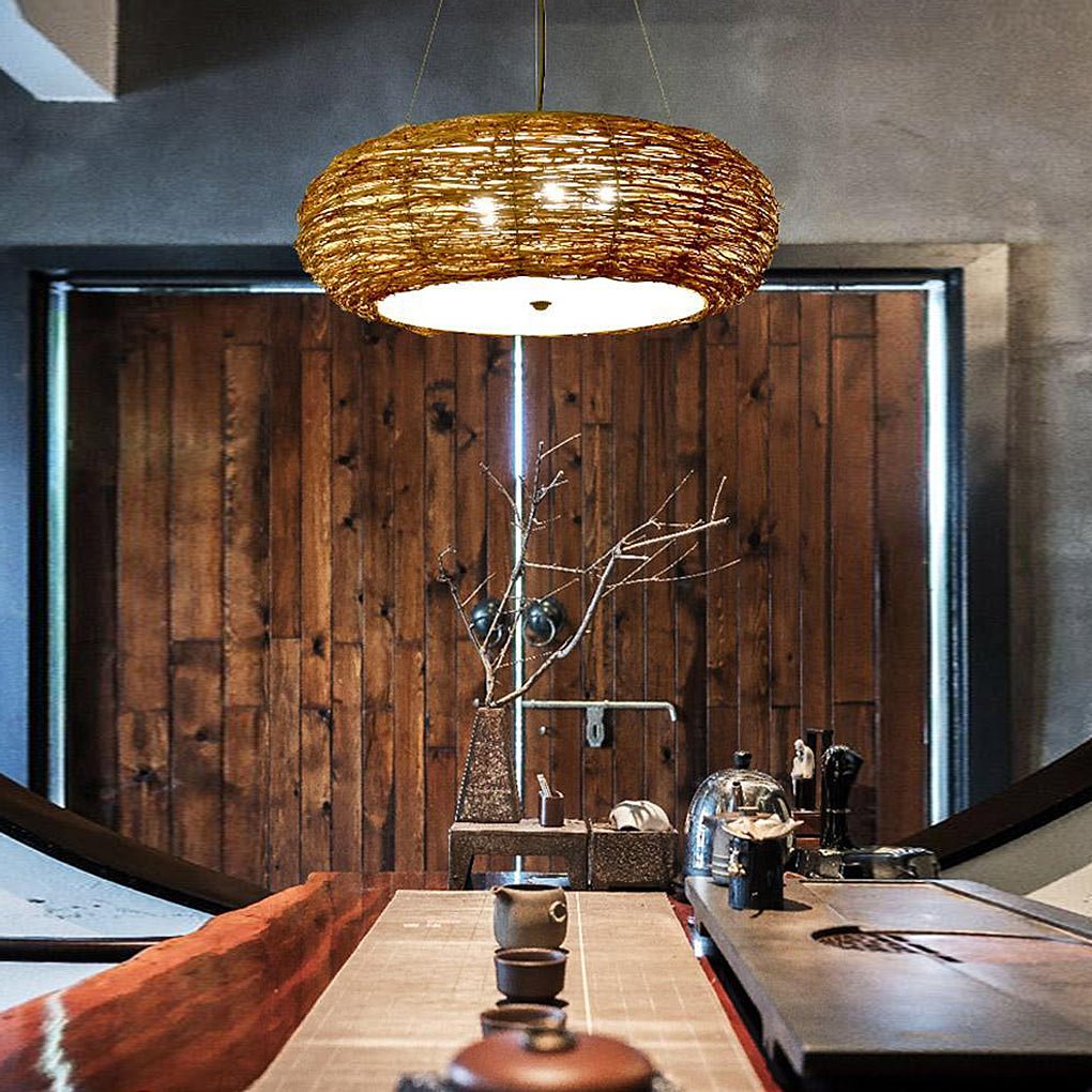 - A well-woven wicker pendant light that has the appearance of a species of peach known as a 'flat peach'.