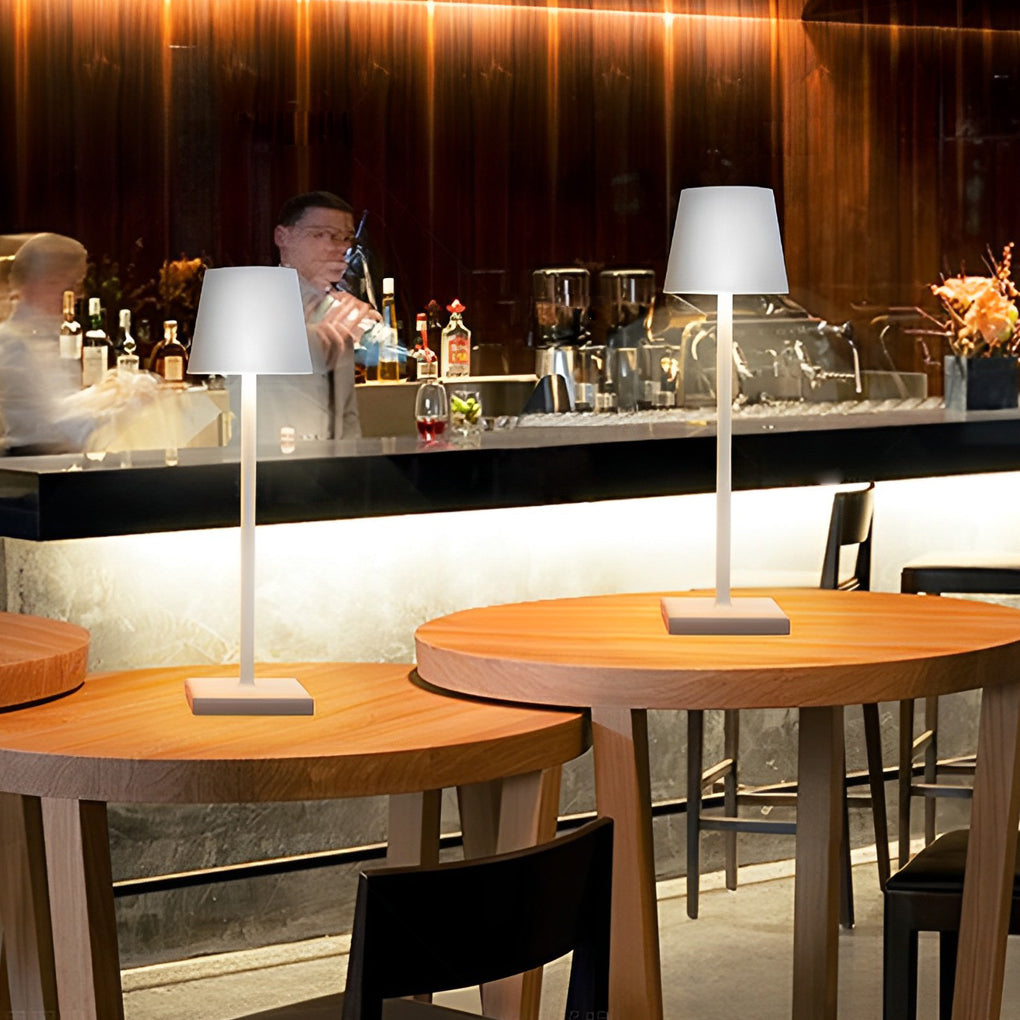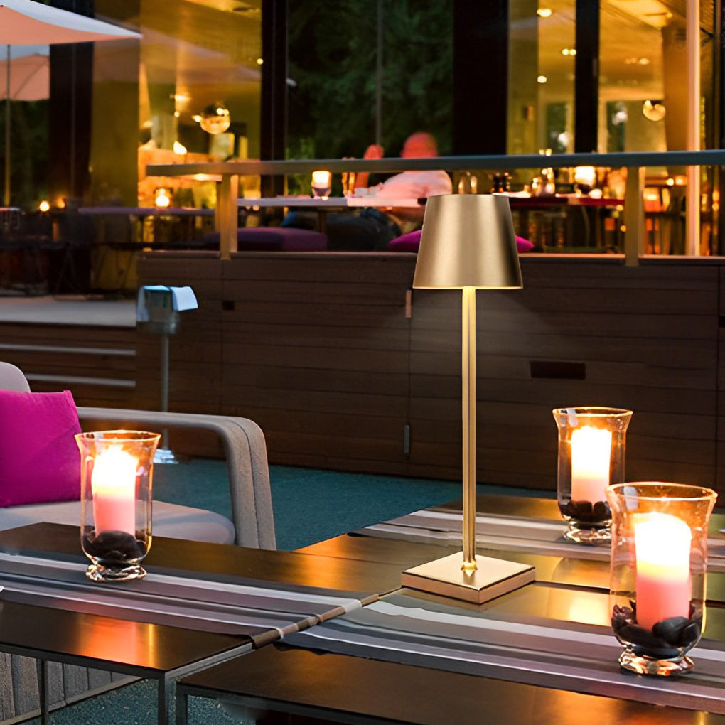- Contemporary and traditional elements combine to form this handsome top hat aluminum table lamp that features one LED light with battery operated operation.