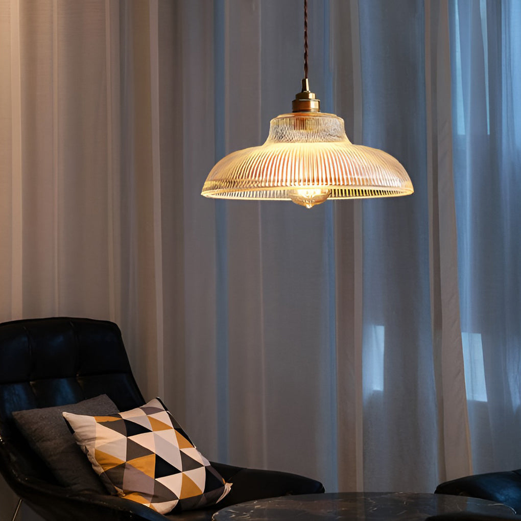 - This chandelier is made of glass material, which is available in clear and amber body colors for character and visual interest. The stylish round thickened glass lampshade glows beautifully under the light. Pendant lamp can be placed with E27 bulbs of different lighting styles to express your space and create the perfect ambience.