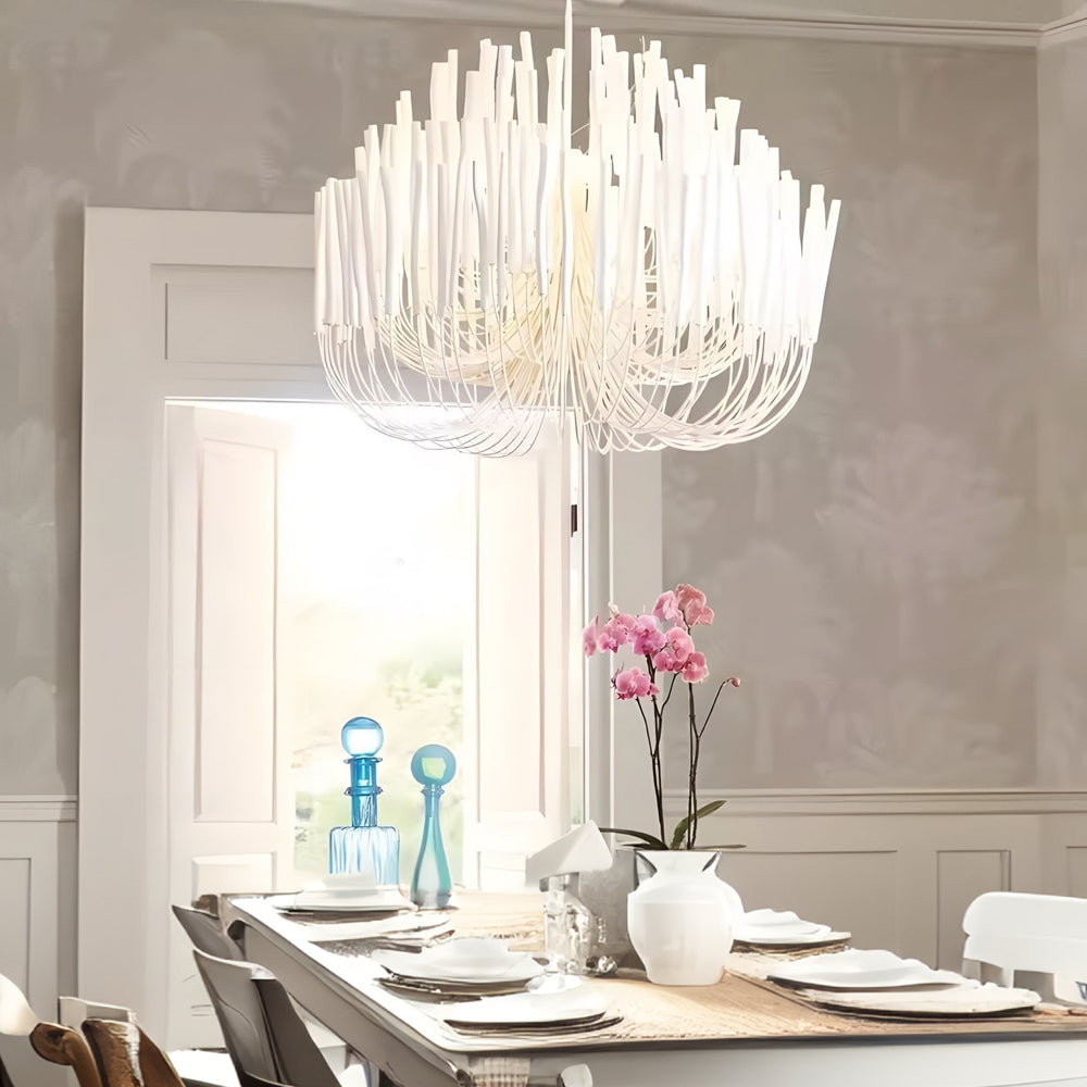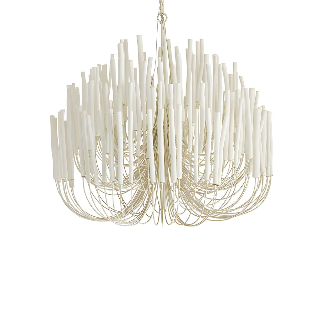 - This White Tilda chandelier features five tiers of candlestick shape, with whitewashed wooden dowels perched atop gracefully u-shaped iron arms, offering a timeless round Tilda fixture that complements your home decor. With curved and pliable iron arms, The wooden rods will arrive with a series of inherent fissures and cracks that will widen and increase over time, and this is considered a natural occurrence and is both beautiful and intentional.